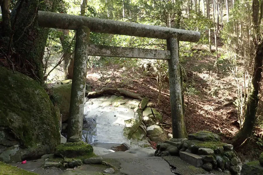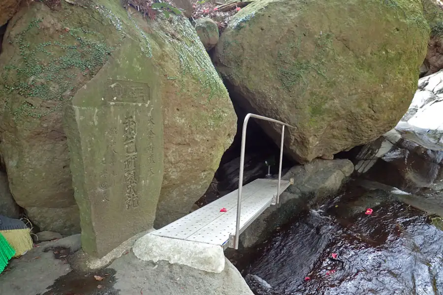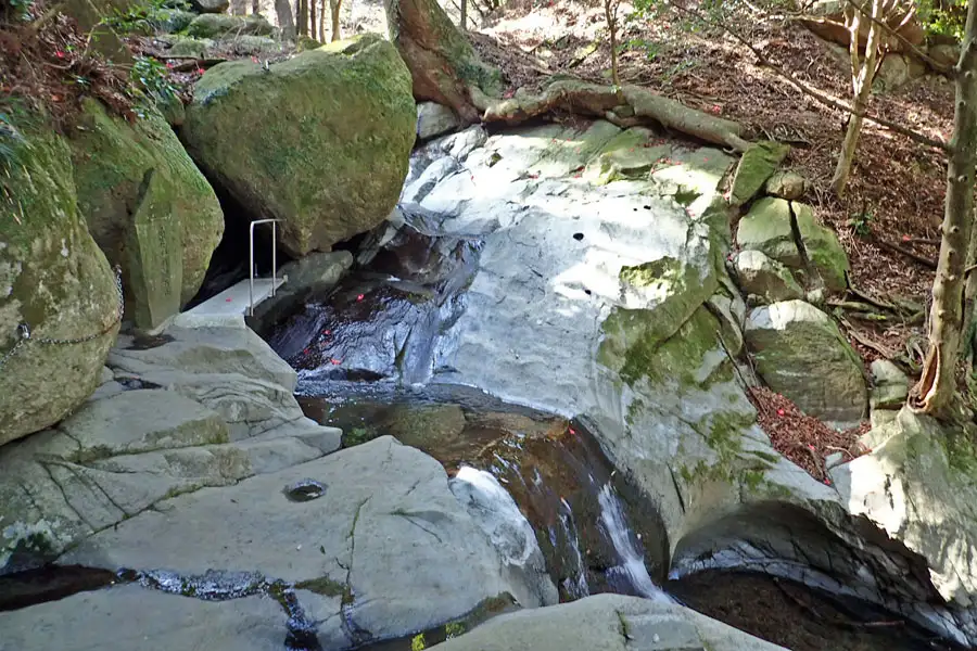 大沢川上流に祀られた弁財天の社です。雨乞いのために祭られたもので滝つぼが釜型をしているのが名前の由来、岩穴には人頭蛇身の石碑が置かれています。