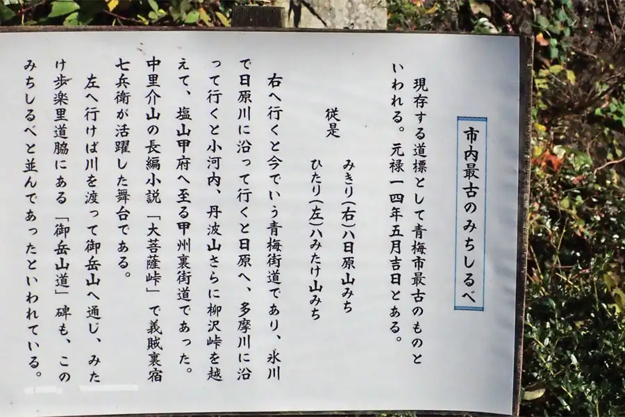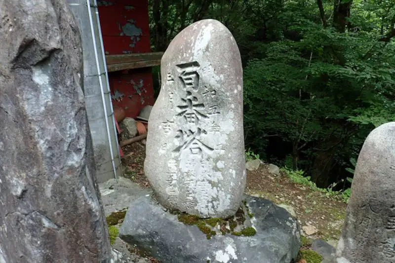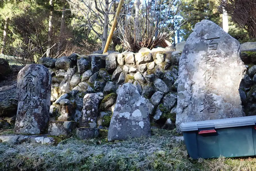 鳩ノ巣渓谷から大楢峠へと登って行く登山道に百番供養塔があります。百番巡礼供養塔は西国三十三ヶ所、坂東三十三ヶ所、秩父三十四ヶ所を巡礼してきた人たちが記念に建てたもので江戸時代後期に全国に広まりました。石面には天保6年(1835年)と刻まれています。