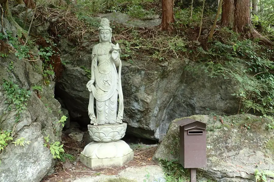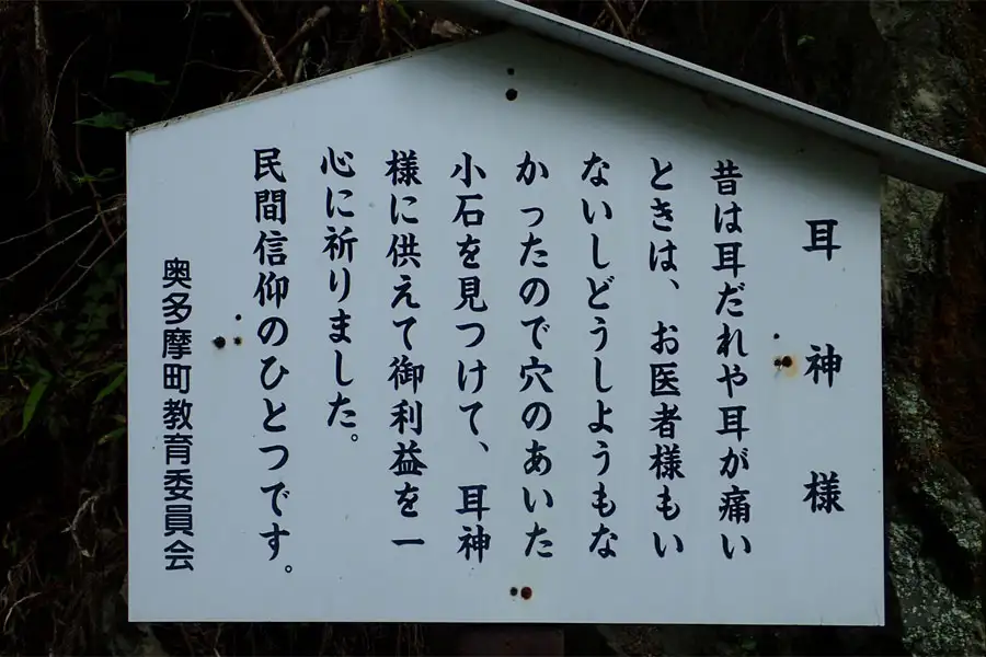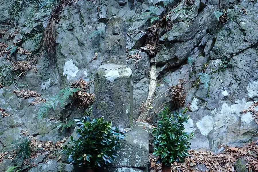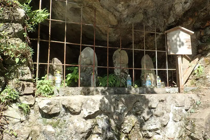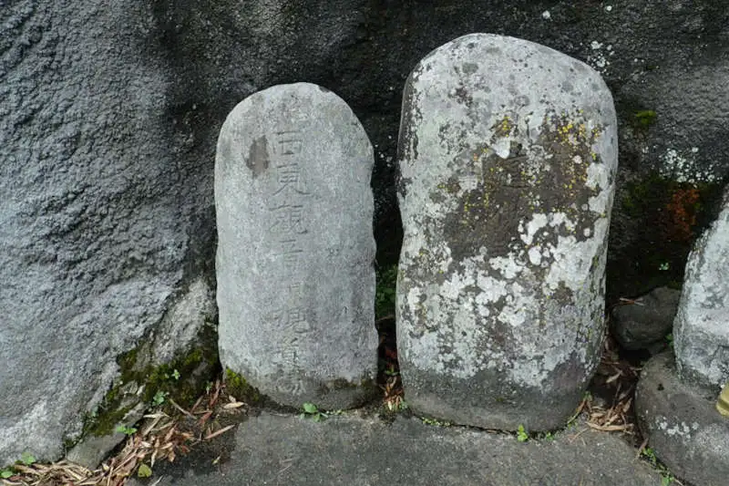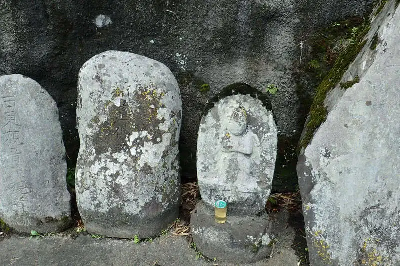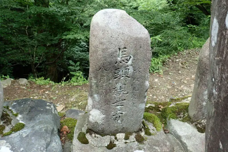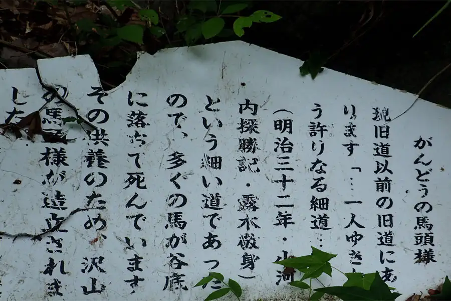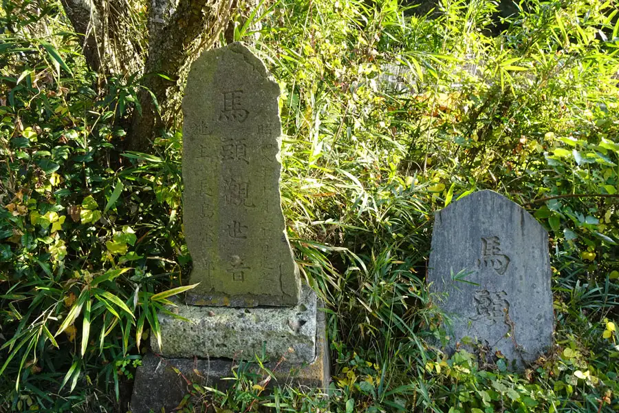 奥多摩むかし道の斜面にがんどうの馬頭観音が祀られています。現地の案内板によるとかつての旧道は細い道で多くの馬が谷底に落ちて死んだと言います。その供養のためたくさんの馬頭観音が建立されたと紹介されていました。
