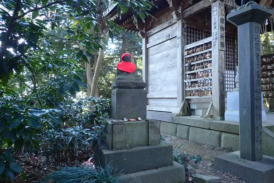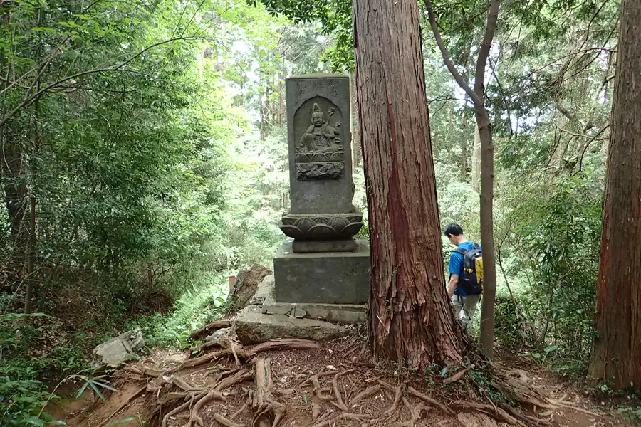 裏高尾の縦走コースが続く小仏峠にはタヌキの像が置かれています。近くには古い石仏と庚申塚がありました。