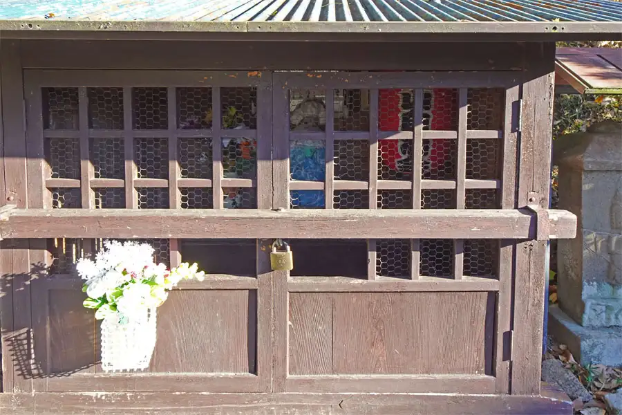 鳩ノ巣渓谷から大楢峠へと登って行く舗装道路にお堂があります。赤い腹かけを掛けたのは青面金剛の庚申塚のようです。