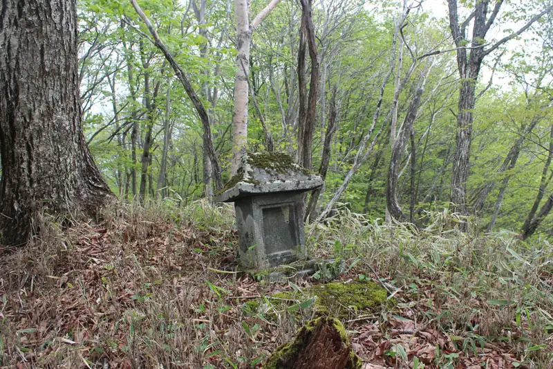 シロヤシオやミツバツツジの咲く稜線には奉納札を納めた古い石祠を見付けることができます。