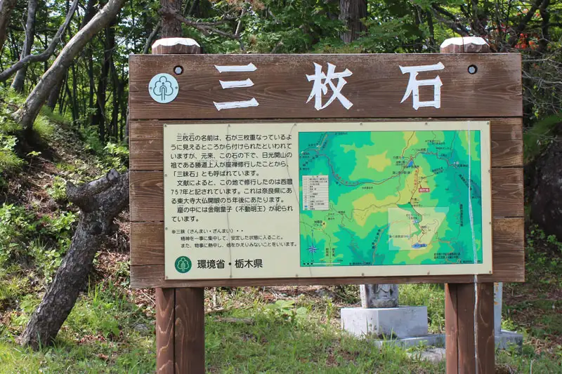 三枚石は日光を開山した勝道上人が座禅修行したと伝えられるところです。岩屋の中には金剛童子(不動明王)が祀られていました。