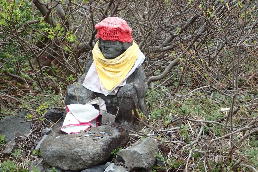 茶臼岳からは姥ヶ平へと下って行きました。灌木が芽吹き始めた登山道には赤い帽子を被った石仏が祀られています。