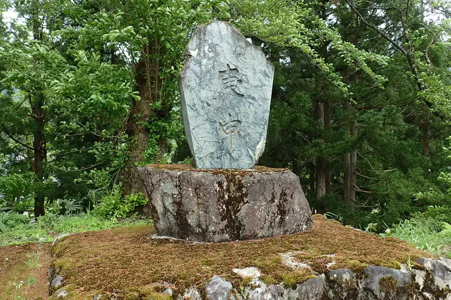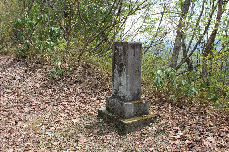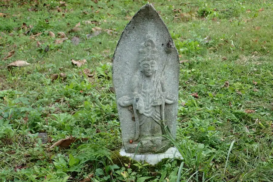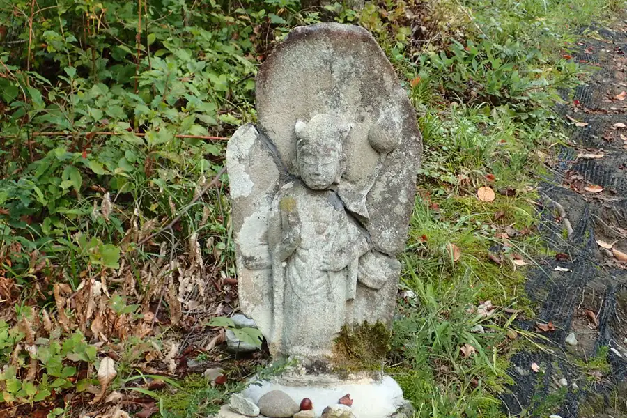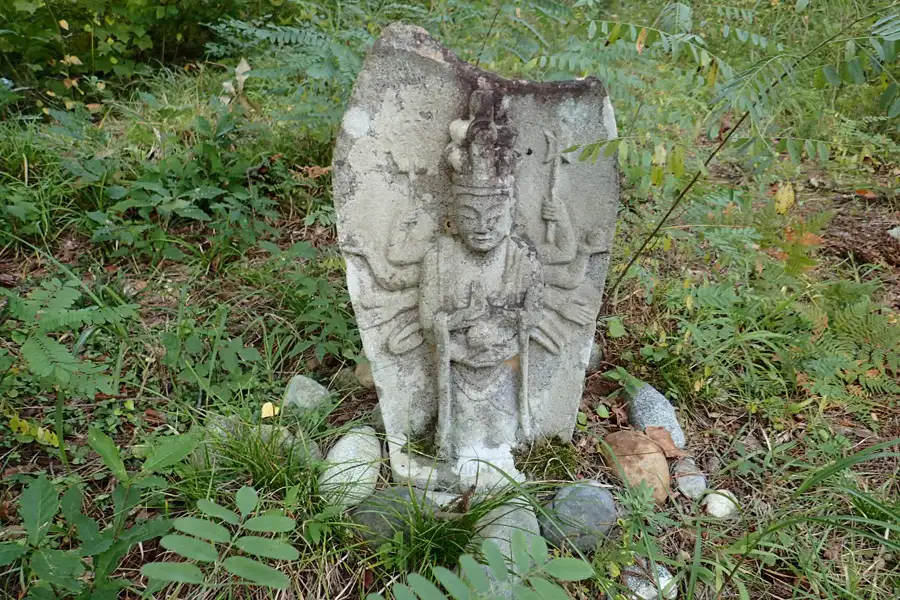 坂戸城へと登って行く登山道沿いに観音像があります。冬には雪囲いが施されるようで鉄の柱が付けられていました。