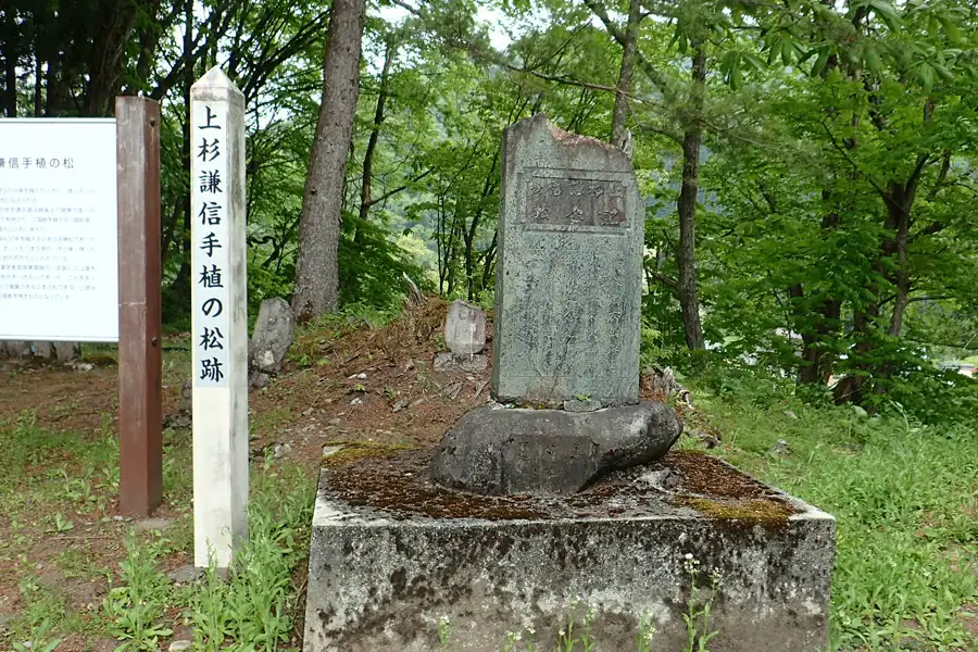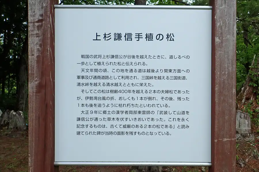 案内板の先には3代目と言われる若い松が植えられていました。この地は三国峠を越える三国街道、清水峠を越える清水越に通じています。関東に進出する上杉謙信が道しるべとして植えたものと言われています。
