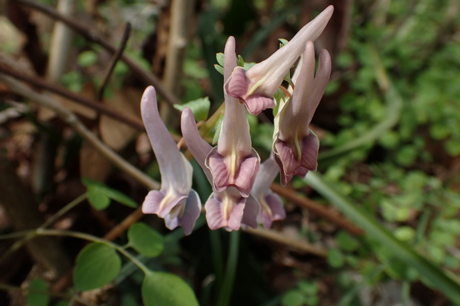 圏央道の高架をくぐると蛇滝の入り口、その先を左に入ると湯の花梅林です。すでに梅の時期は過ぎていますがここにはアズマイチゲの群生、目を落とすとヤマエンゴサクの紫色の花も見付けることができます。