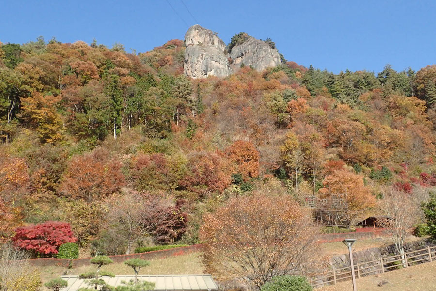 関越道の渋川伊香保インターから吾妻川沿いの道をしばらく走ると中之条です。たどり着いた道の駅の駐車場からは真っ赤に色付いた嵩山がそびえていました。