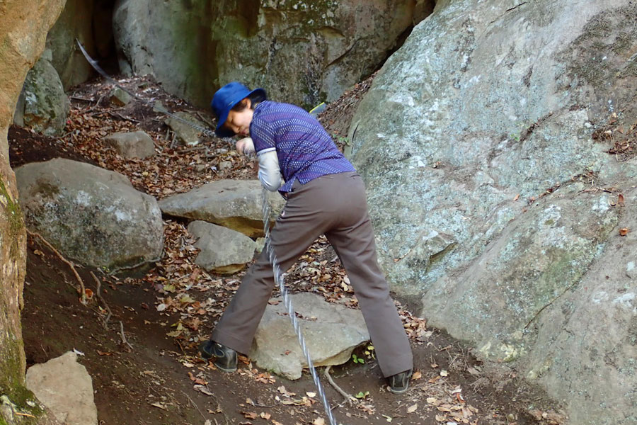 東屋に戻り明るい尾根道を登って行きます。三社神社の祠の脇を回り込むように下って行くと胎内くぐりです。狭い岩の裂け目を潜り抜けると滑りやすい急坂、鎖をたどりに下ることになりますが気の抜けない所、この先は弘法の筆跡など幾つかの石仏をたどり東登山道へと続いているようです。我々は鎖場の途中から三社神社へと戻ることにしました。