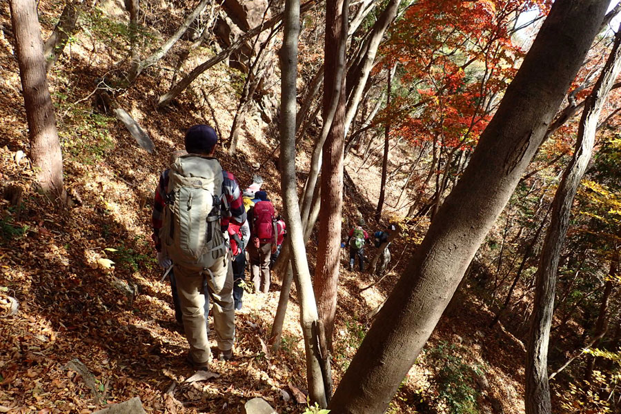 紅葉に包まれた東登山道を下っていきます。ジグザグに下って行く登山道はやがてヒノキ林に、左手には見上げるような切り立った岩場がそびえています。