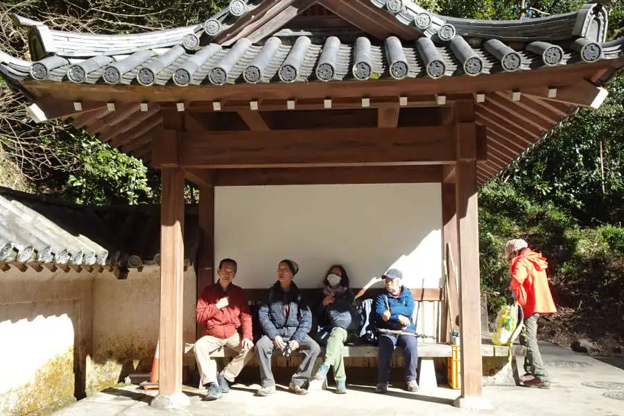 南峰からは緩やかな尾根を下って行きます。伏姫籠穴へと下って行く道を左に分けると里見八犬士終焉の地の東屋です。ここからは東京湾を挟んで白い雪を被った富士山を眺めることができました。