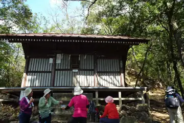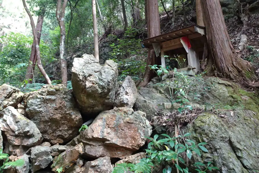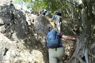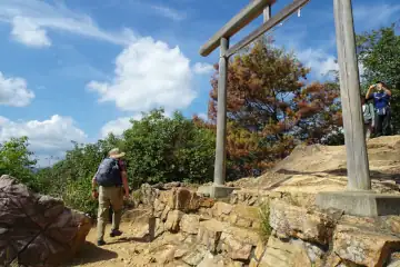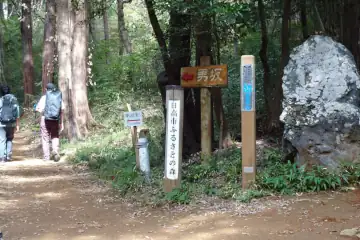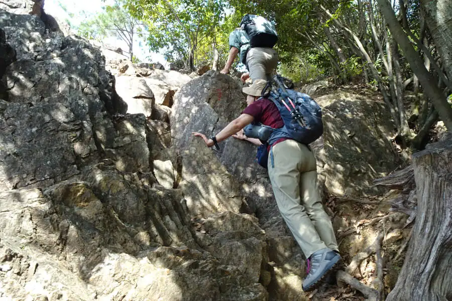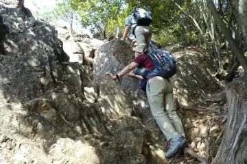 雑木林の中をわずかに登ると男坂からの道を合わせ岩場が始まります。鎖などはないもののホールドはしっかり確保でき大人のアスレチックと言ったところです。