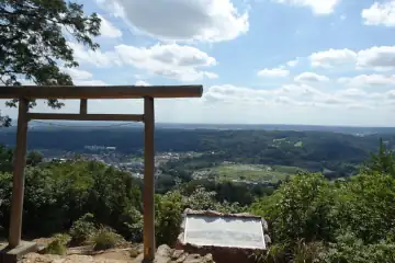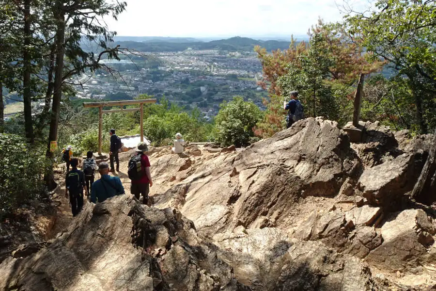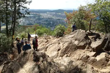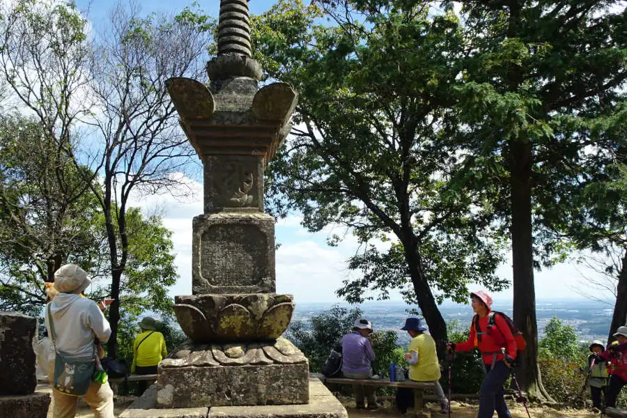 ひと登りすると金毘羅神社の広場、目の前には飯能の町並みが広がっています。ここから岩っぽい坂道をひと登りすると宝篋印塔が置かれた日和田山の山頂です。