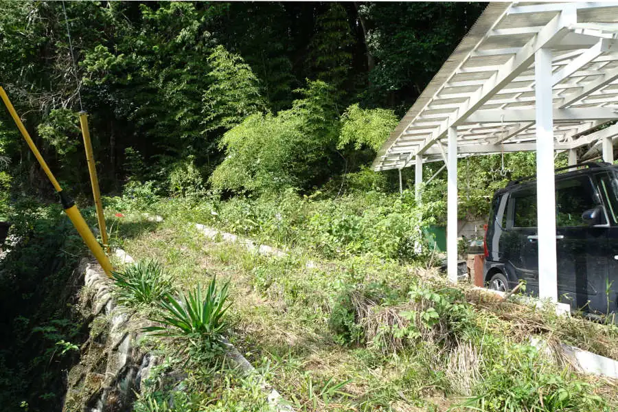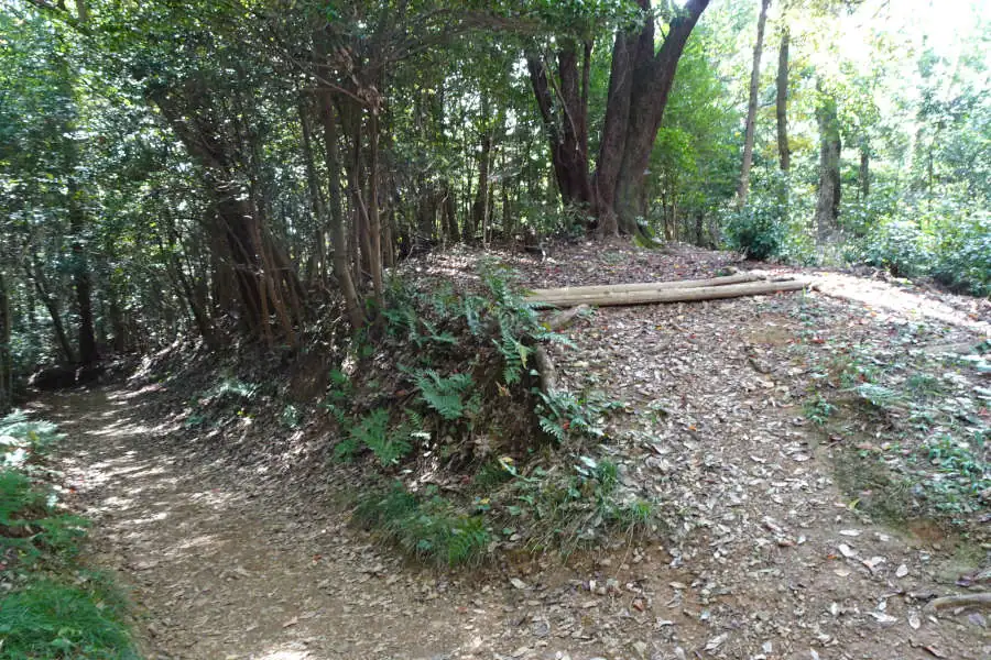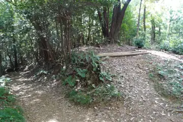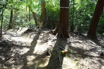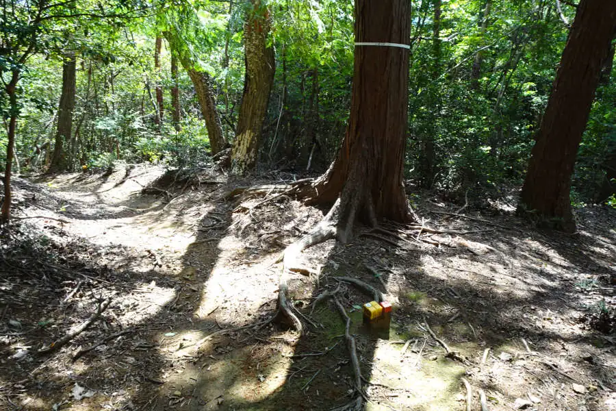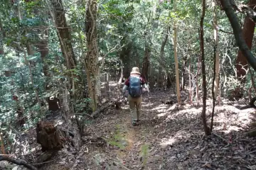 高指山の手前から自然歩道を離れ緩やかな雑木林を下って行きます。あまり人が入っていないようで所々に蜘蛛の巣がかかっていました。暫くすると木の幹に「しし岩15分」のテープが巻かれていました。