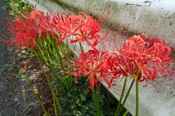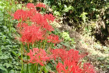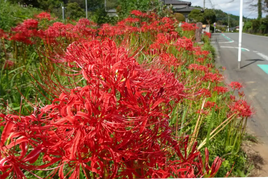 やがて車の音が聞こえてくるようになると民家の裏にたどり着きました。道路沿いには高麗川、澄み切った流れは巾着田へと続いているようです。また道端には真っ赤なヒガンバナが咲いていました。数日前まで続いていた猛暑が収まったこともあり、一斉にヒガンバナが咲き始めたようです。