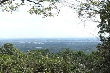 男坂の先には見晴らしの丘コースの分岐、ここから急な坂道を登って行くと日高市ふるさとの森の標柱がある広場です。ベンチの先には濁った空の下に町並みが見え隠れしていますが木が伸びすぎているためか見晴らしの丘の名前も今一つです。