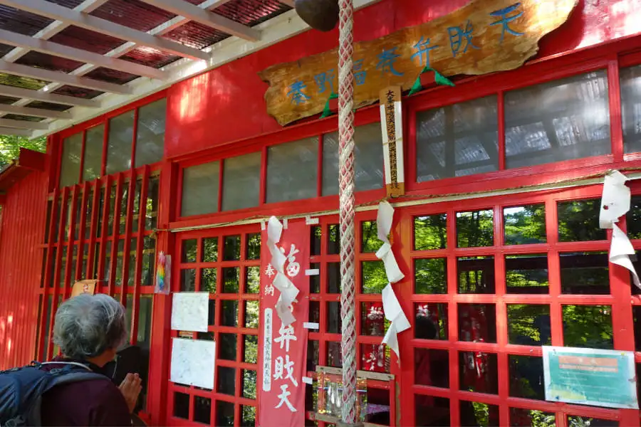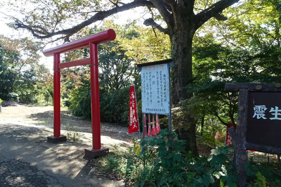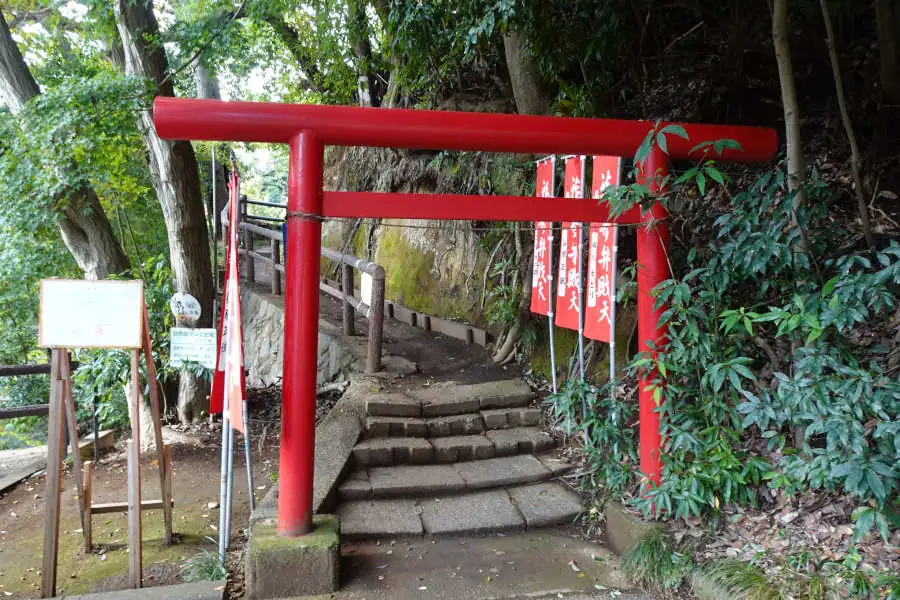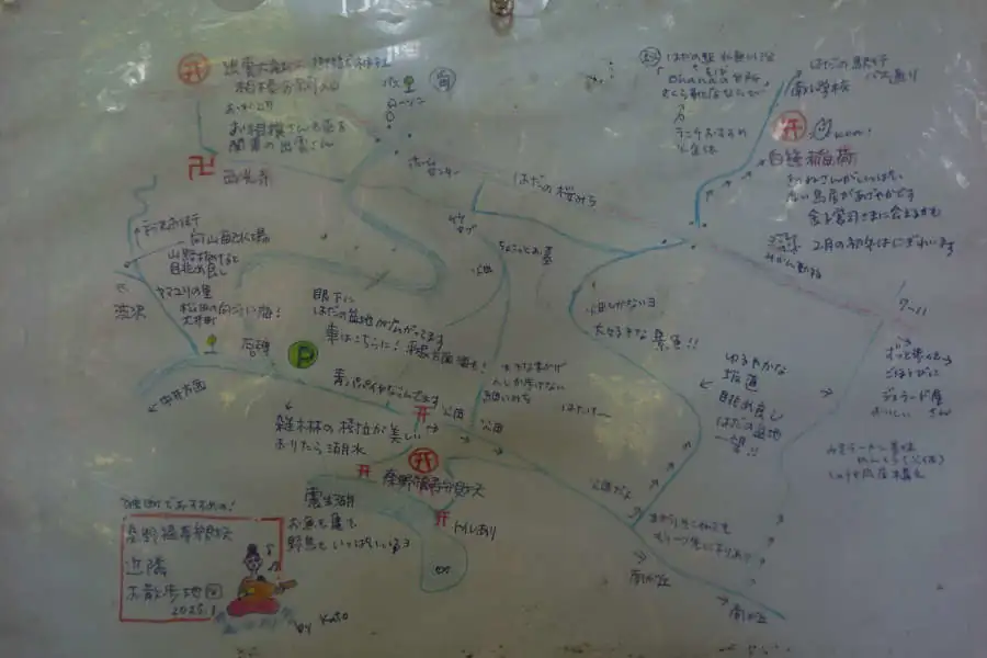 湖畔に架かっていた橋は今回も工事中、散策路を一周することはできません。近くにある福寿弁財天は南はだの村七福神と鶴亀めぐりの神社、真っ赤に塗られた拝殿の前には散策コースの手作りのMapが貼られて言いました。