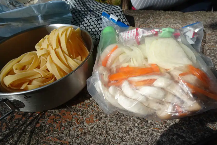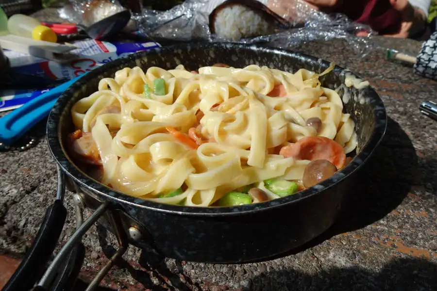 ハイキング用のフライパンとシェルカップを持っていきました。フィットチーネをフライパンで茹でるのは難しかったのでシェルカップで茹でましたが、蓋も持っていけば良かったでした。