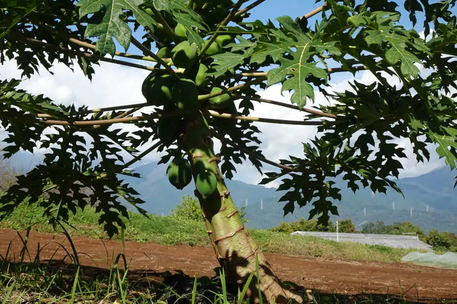 震生湖の入り口から渋沢ハイキングコースへ、付近は耕作地となっているようで冬大根や自然薯、青パパイヤが植えられています。青パパイヤは秦野の新たな産品として期待されているようです。暖かいと言っても南国ではありません。赤く色付くことはなく青いまま出荷されるようでした。