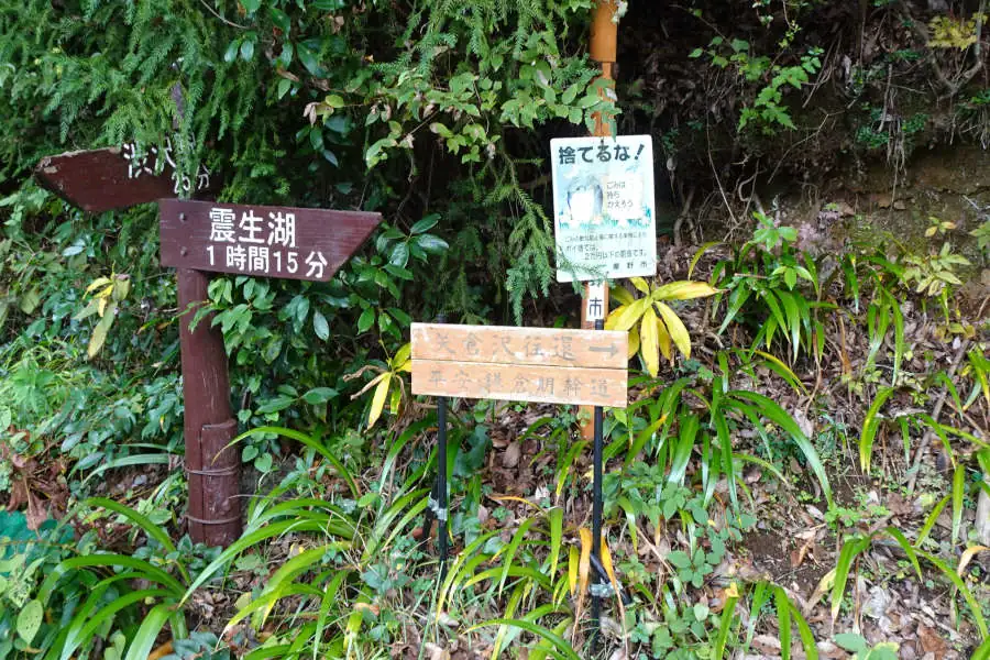 震生湖は関東大震災の土砂崩壊で作られた堰止湖です。まだ紅葉には早いようですが静かな湖面には緑の山肌が影を映していました。湖畔には糸を垂れる釣り人が数人、湖畔をめぐるハイカーも目に付きます。
