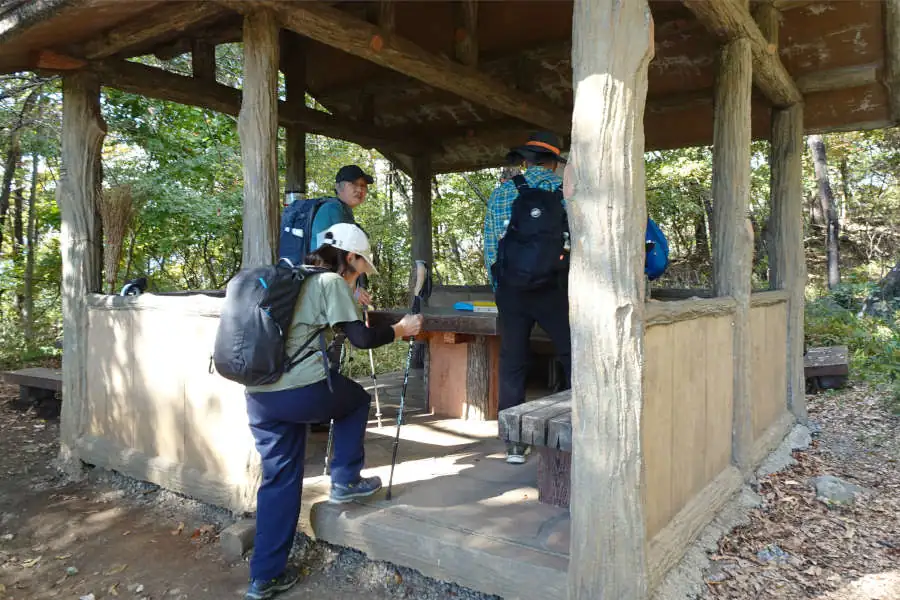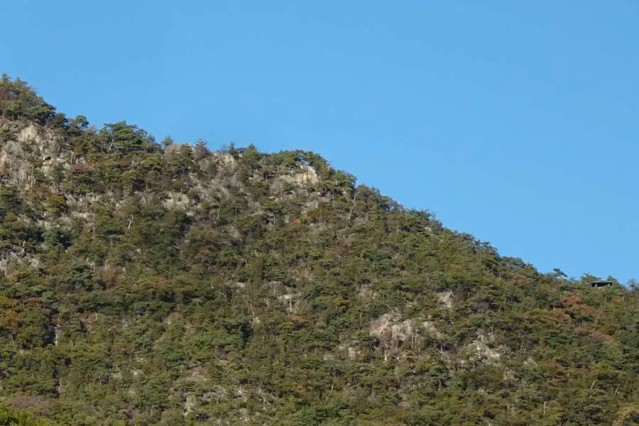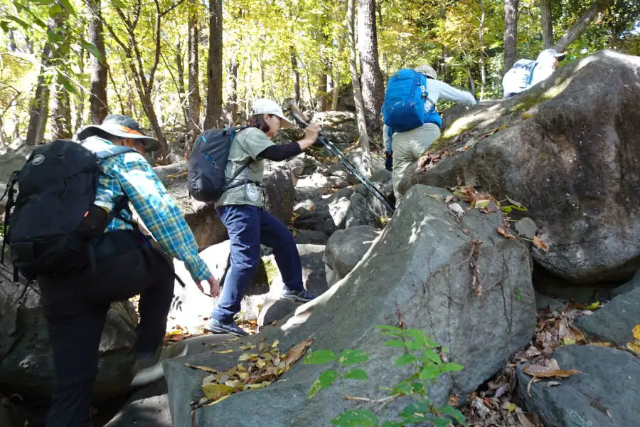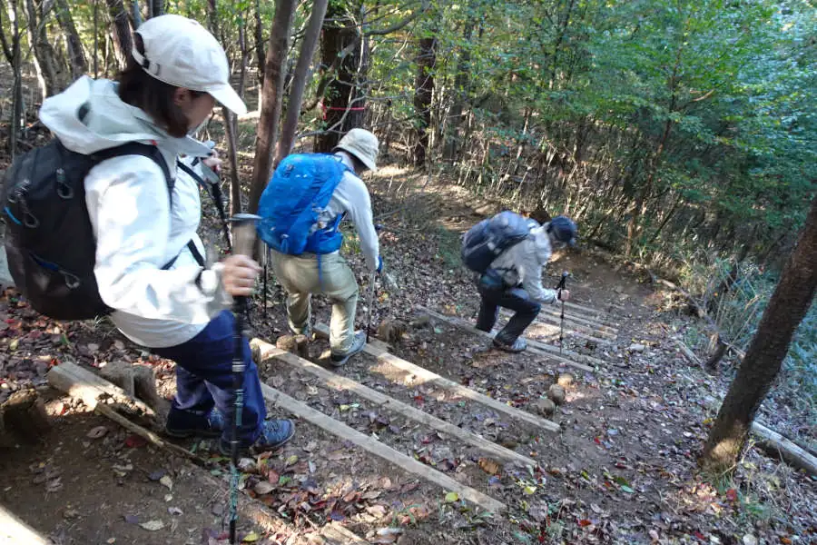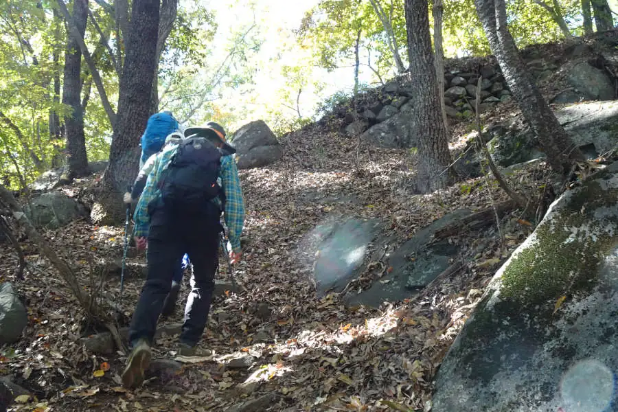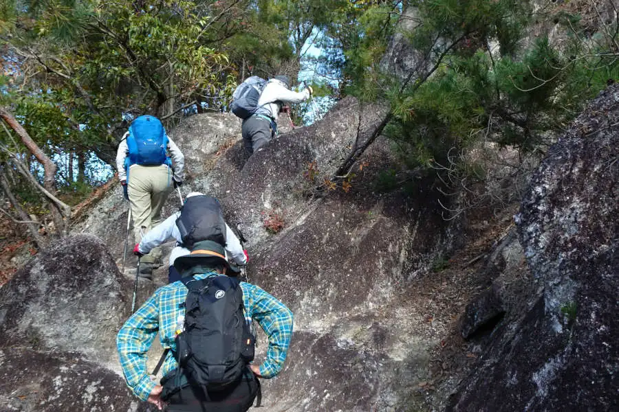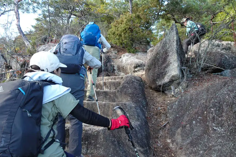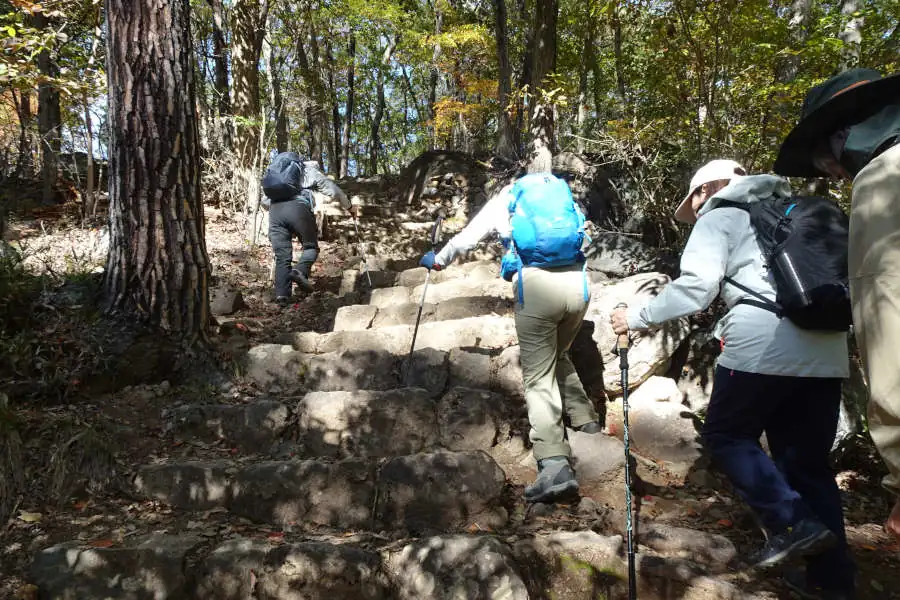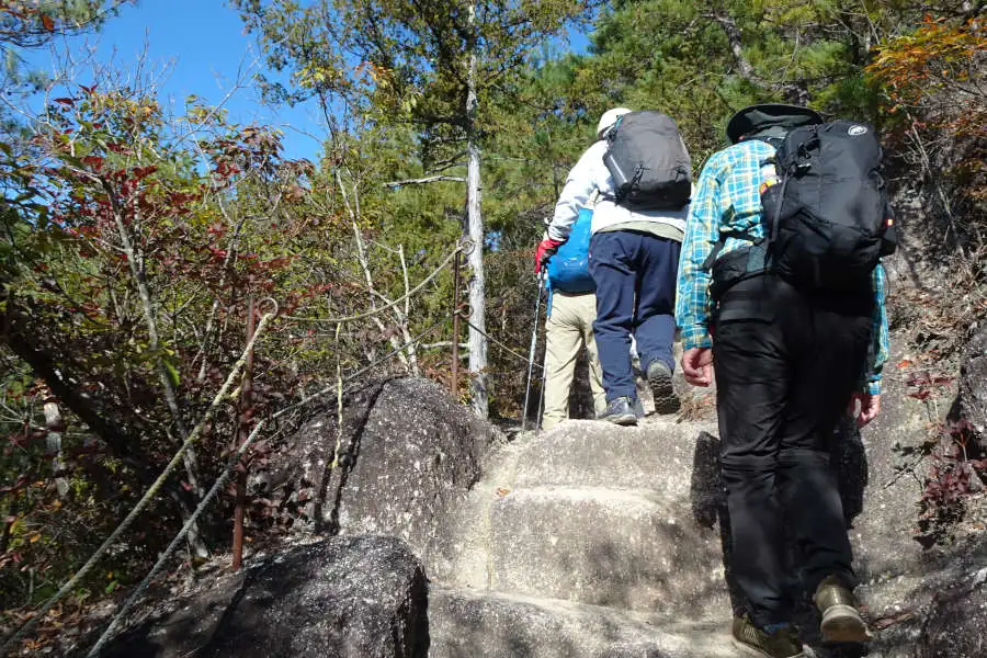 途中のベンチを越えると梢の先に山頂付近の岩峰が見え隠れしています。登山道はよく整備された登りで、岩を削った石段、登山道脇にはガイドロープなども張られています。