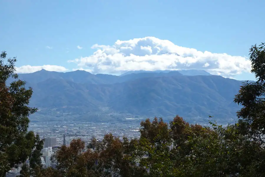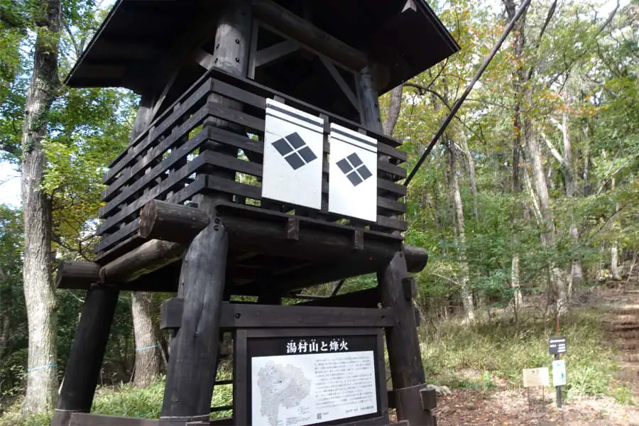 御坂山塊の上には頭を雲に隠した富士山、見え隠れする山頂は白い雪で覆われているようです。湯村山城の土塁などを見ながら僅かに下ると復元された狼煙台、ここからは石段の登山道を登って行くことになります。