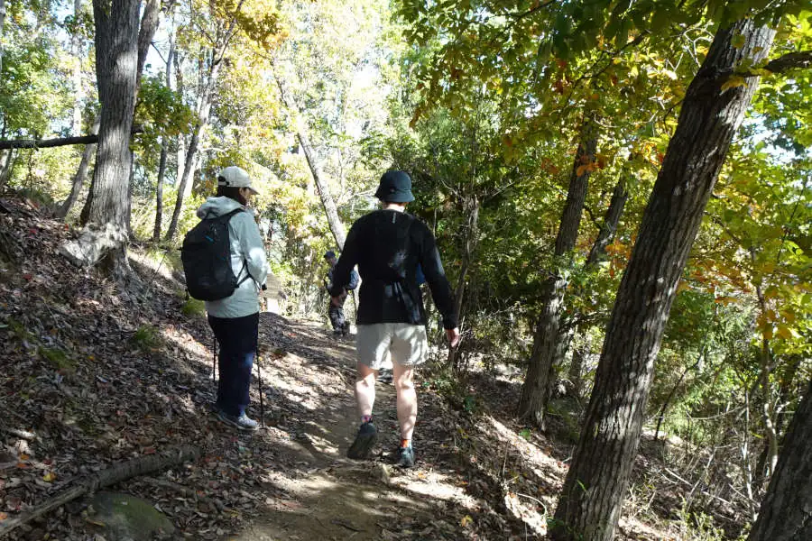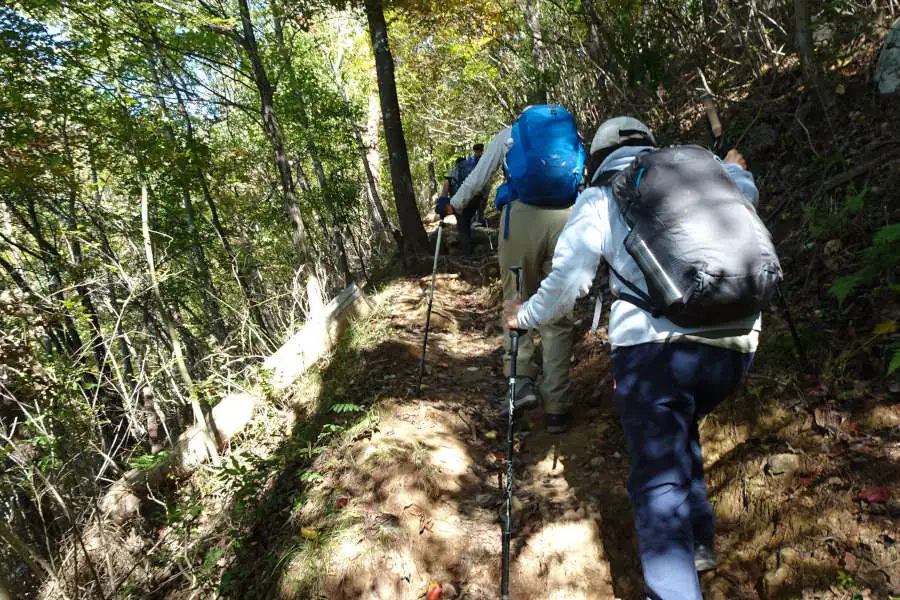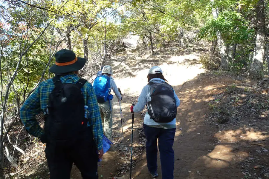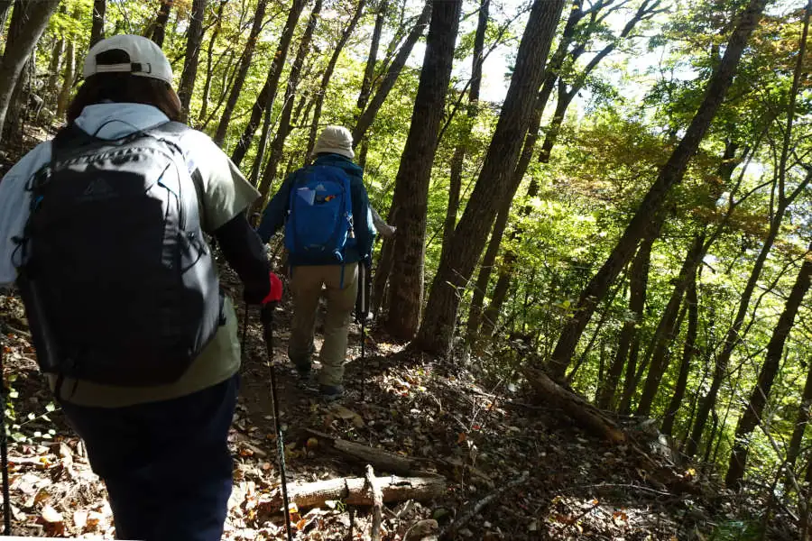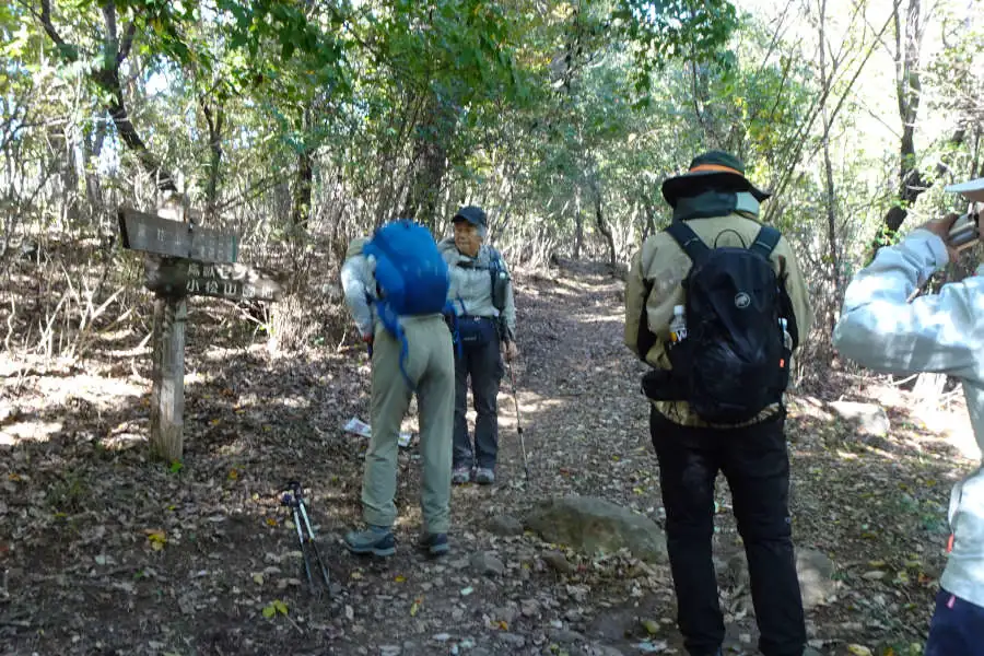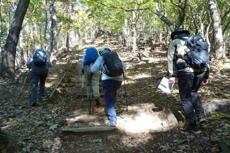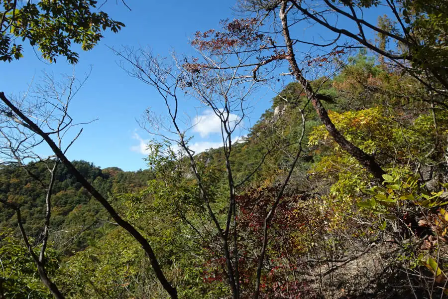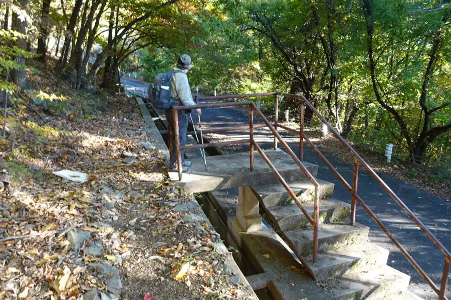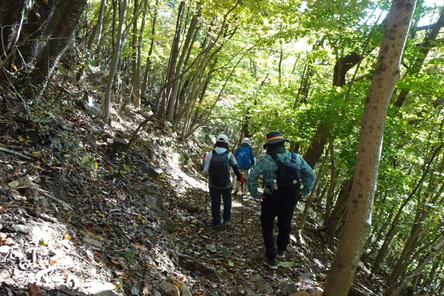 そろそろ紅葉の季節になっているようで広葉樹の稜線は黄色く色付いています。ひと登りすると法泉寺山です。山頂は踏まず巻き道を下って行きます。木の階段が付いているものの段差が大きく結構歩き難いところでした。