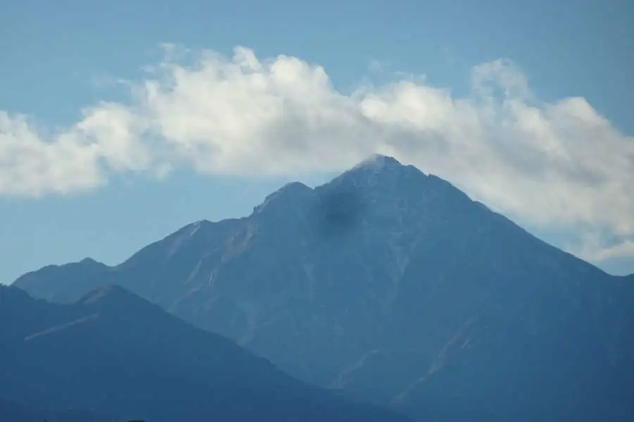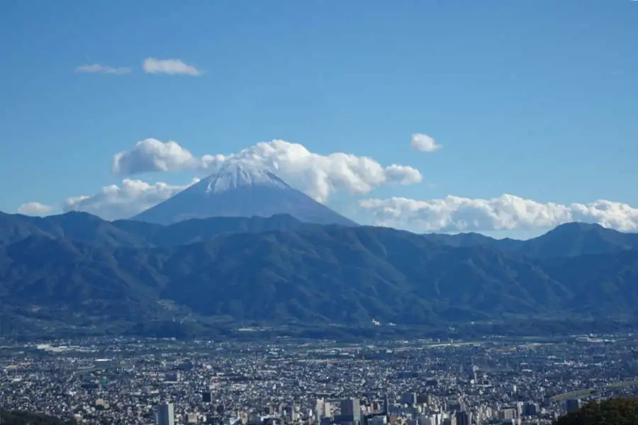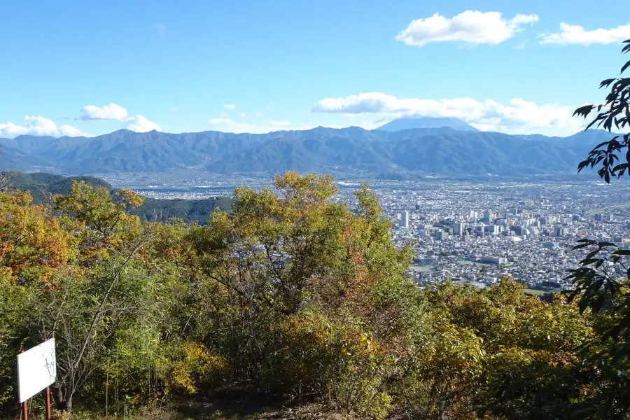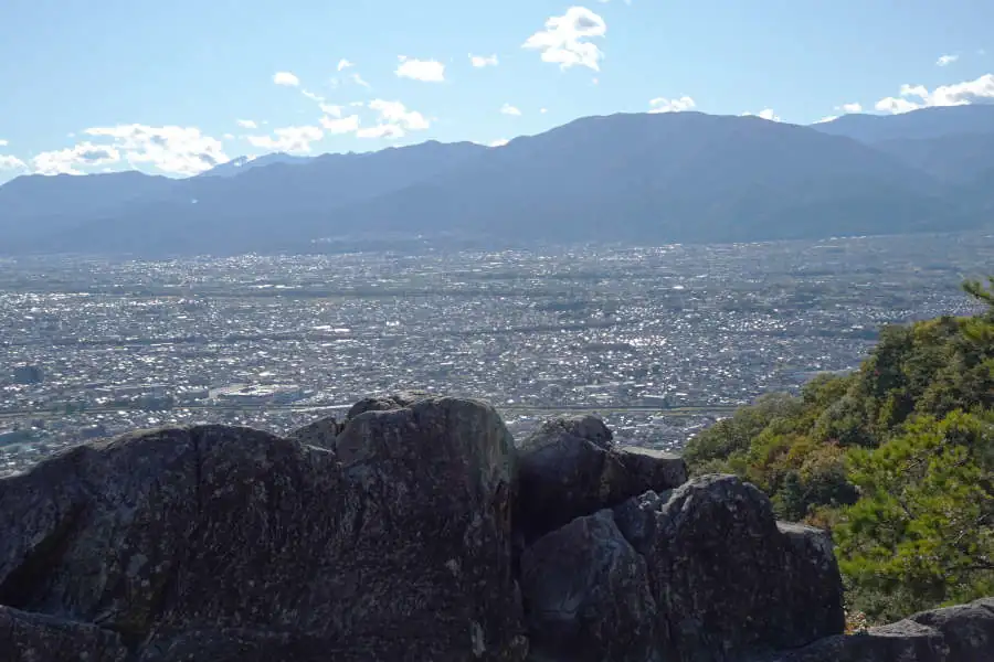 急な岩を登ると東屋が建っています。広がる甲府の町並みの先に御坂山塊、右手には櫛形山や鳳凰山の稜線が続いていました。観音岳の隣には地蔵岳、その山頂にはオベリスクが見えています。鳳凰山や甲斐駒は初冠雪とか、山頂付近は白い雪に覆われていました。