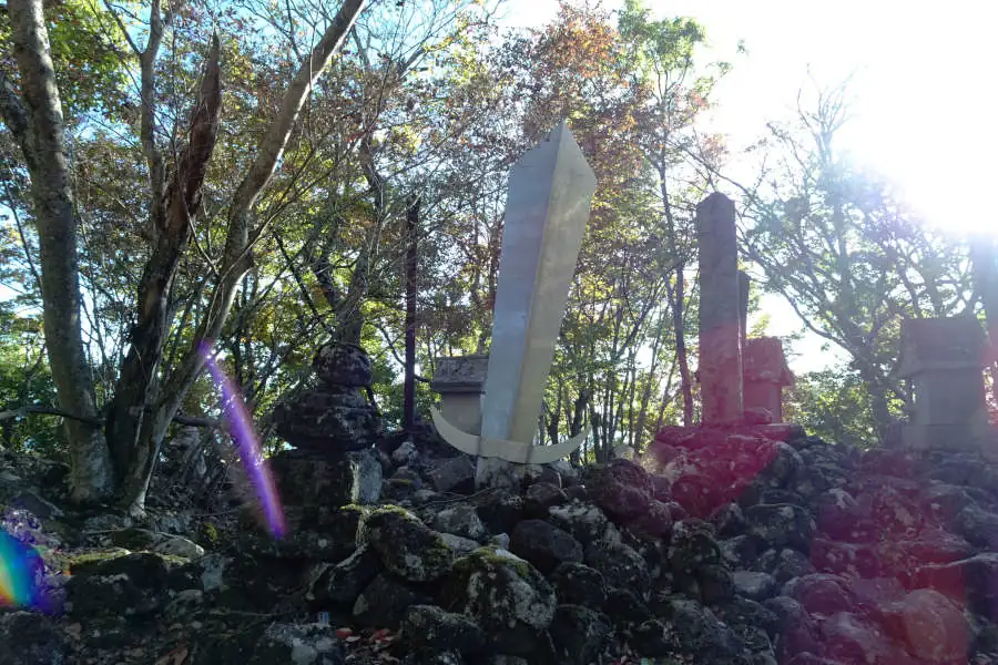 小さく登ったところが天狗山です。小さな石が積み重なるコブの上には大きな刀と石祠が祀られていました。