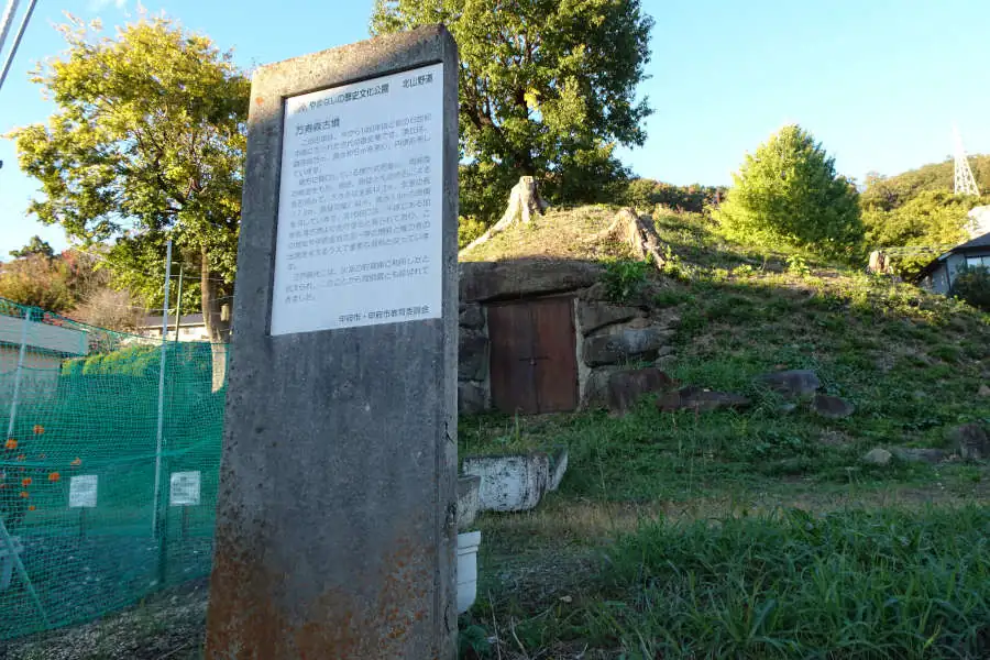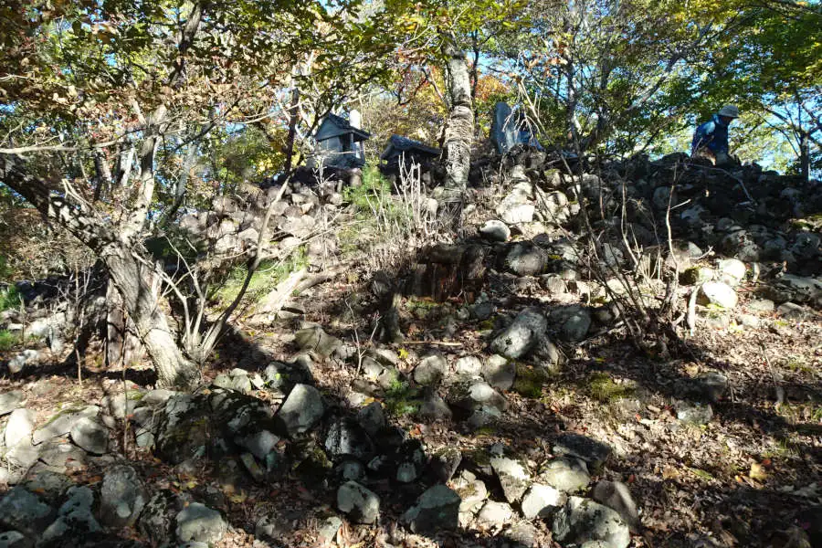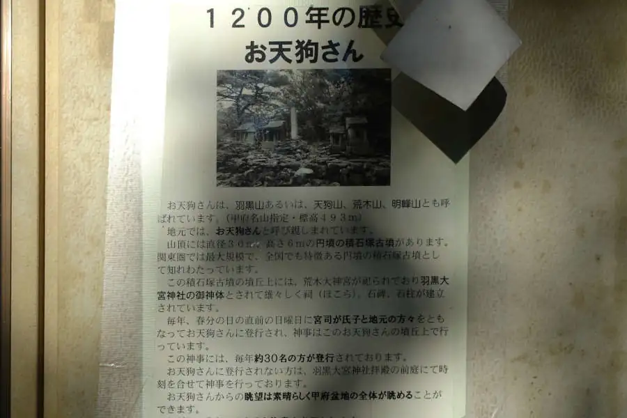 山頂直下には神社、その扉には「1200年の歴史・お天狗さん」の案内があります。ここは古い積石塚古墳とか、近くの石を積み上げたものでしょうがこれだけの石を積むのはなかなか大変と言うことでしょう。