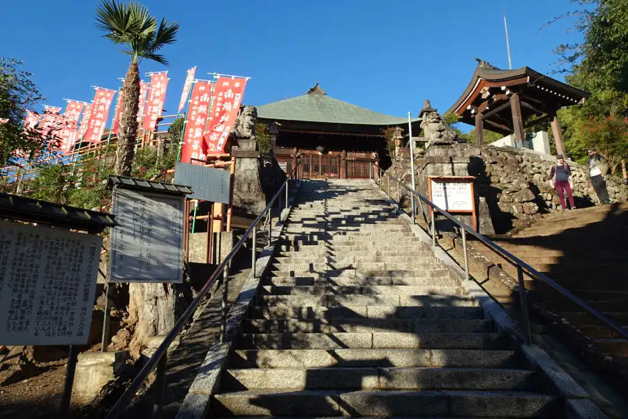 東屋から山頂へは石段の道が続きます。ガイドロープの先には踏み跡、岩が切れ落ちた先は展望台となっているようでした。