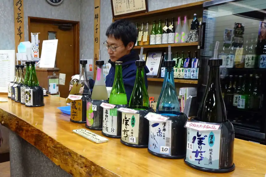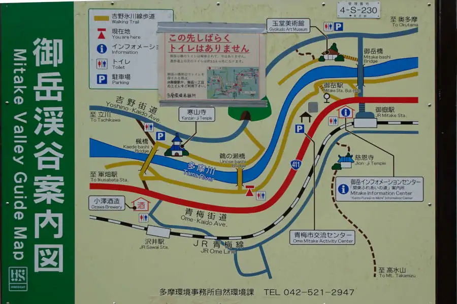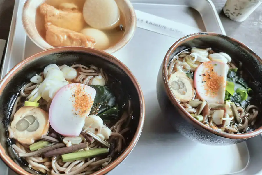 鵜瀬橋近くの東屋で一休みしたのちさらに下って行くと楓橋です。清流ガーデン澤乃井園の広場には澤乃井の利き酒ができる利き酒処、蔵元の売店、豆らく、ままごとやなどのレストランもあります。軽食を売っている店で山菜そばとおでんの少し早いお昼ご飯にしました。