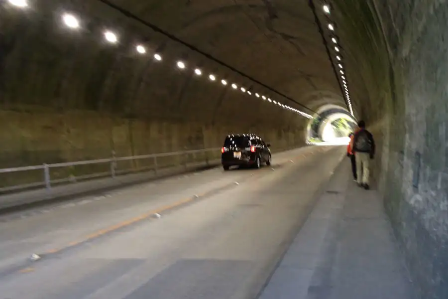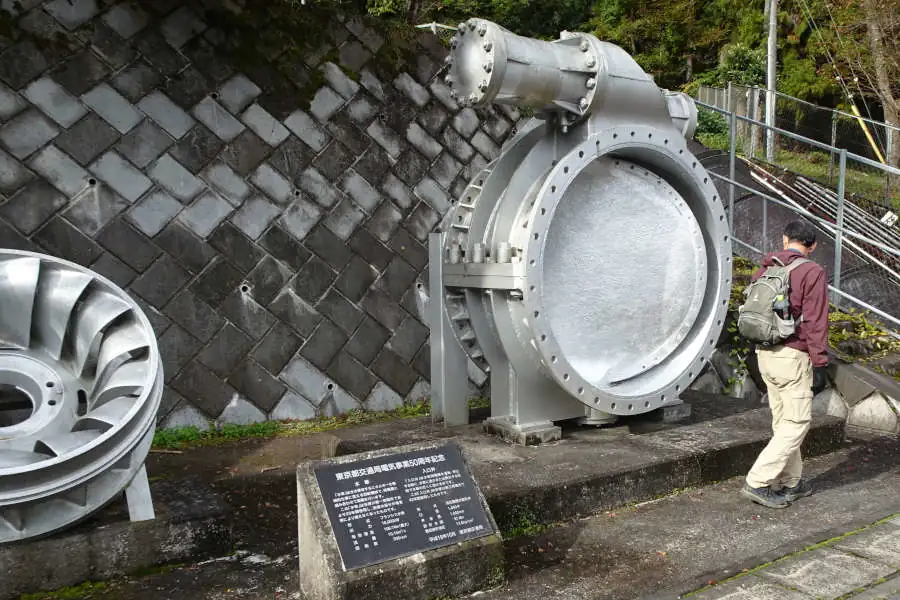 たどり着いた御岳苑地の駐車場は御嶽駅から離れていることもあり閑散としています。ここは東京都の多摩川第三発電所の近くです。道路沿いには発電所の水車や入口弁が展示されていました。