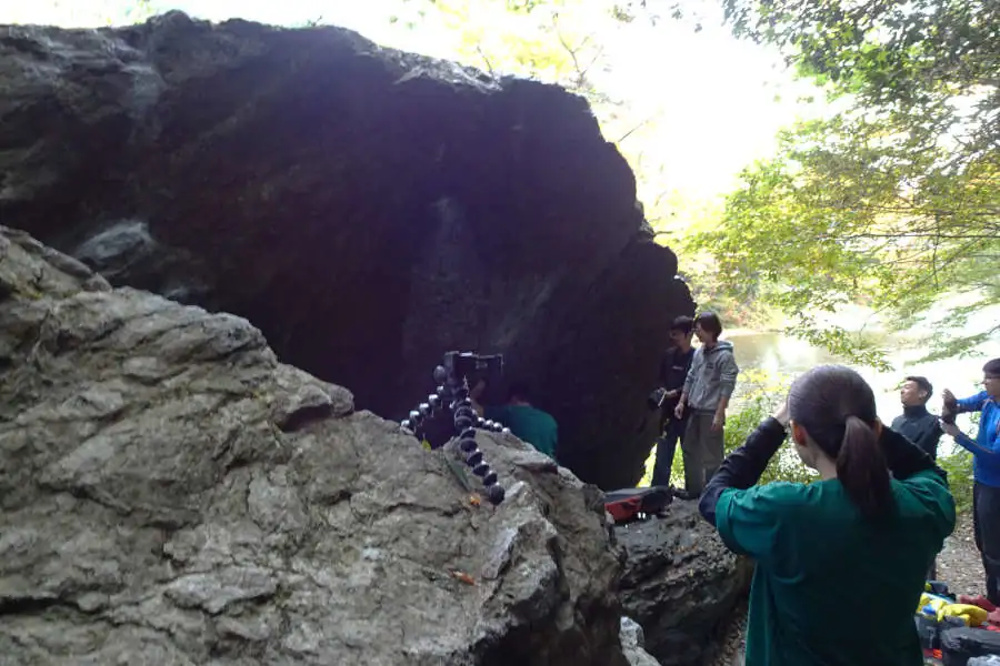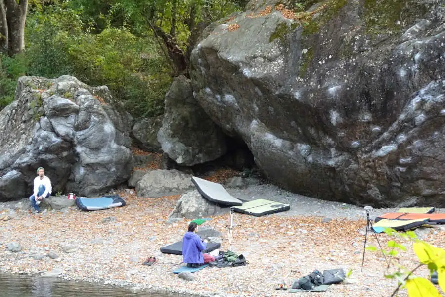 ここからは多摩川に沿った遊歩道を歩いて行きます。途中にある大きな岩、ここでは若者がボルダリングを楽しんでいます。