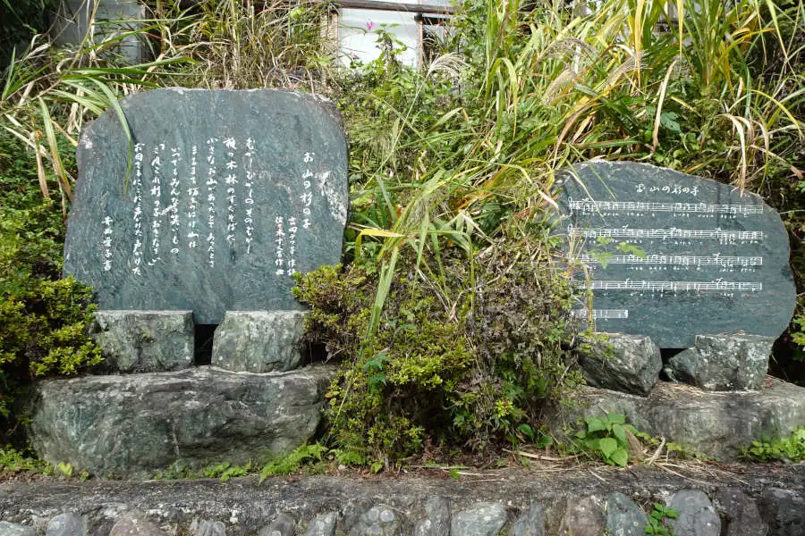 御岳橋の下をくぐると赤く色付いたモミジが目立つようになります。鵜瀬橋の近くにはお山の杉の子の歌碑がありました。小学校の唱歌としても親しまれた童謡です。