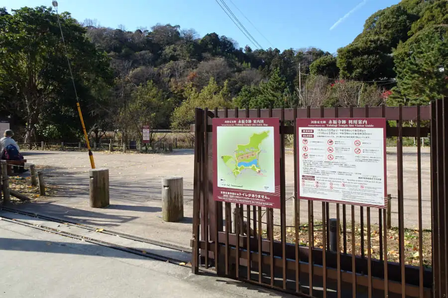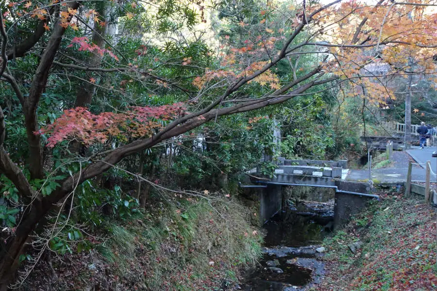 緩やかに谷を下るとシダなどに覆われる凝灰岩の地層、住宅地の中をわずかに下ると永福寺跡です。源頼朝が奥州平定で亡くなった人たちの鎮魂のため建立されたとされ、二階堂・薬師堂・阿弥陀堂の基壇や浄土庭園が再現されていました。園内の紅葉は今が真っ盛り、たくさんの観光客が園内を散策していました。