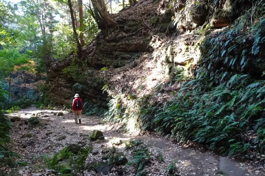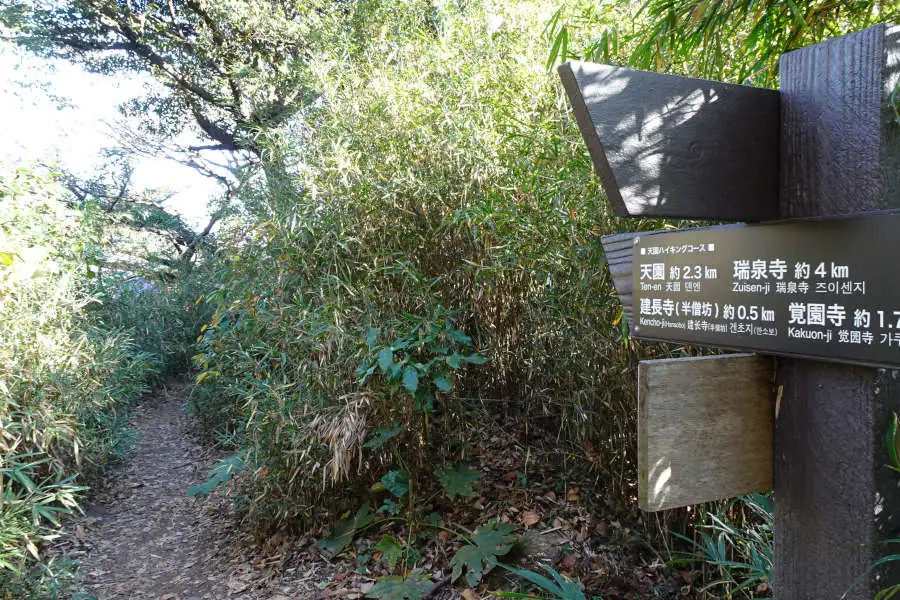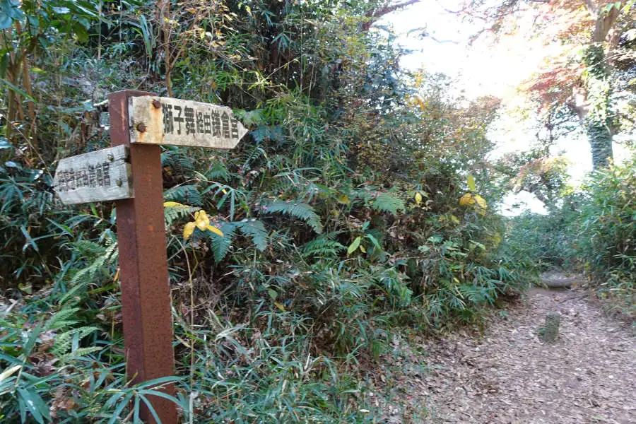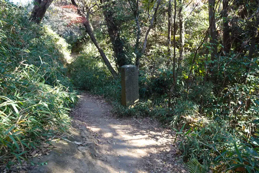 雑木林の中をたどる整備されたコースは覚園寺への分岐や小さな岩場などを越え今泉台と覚園寺の分岐にたどり着きます。
