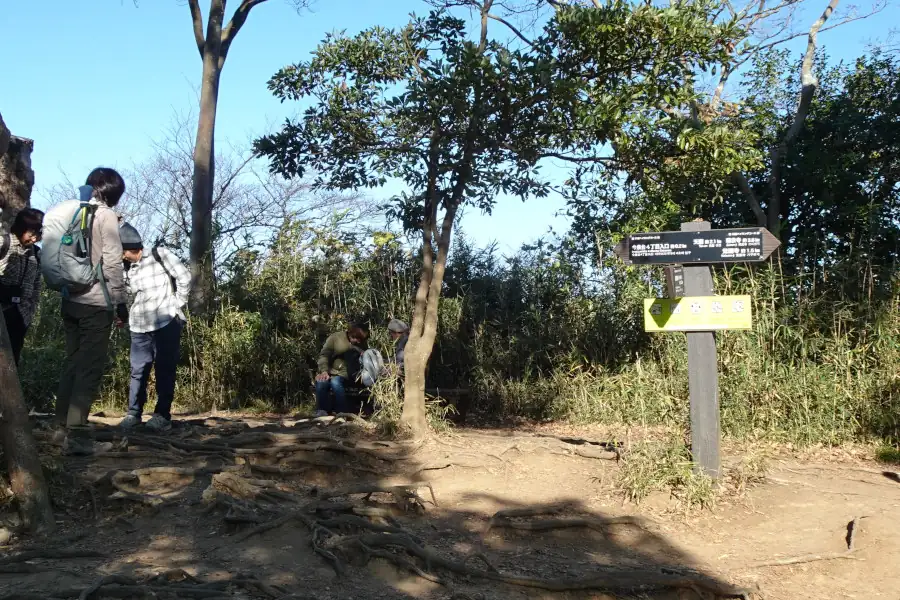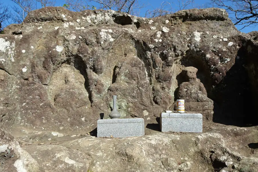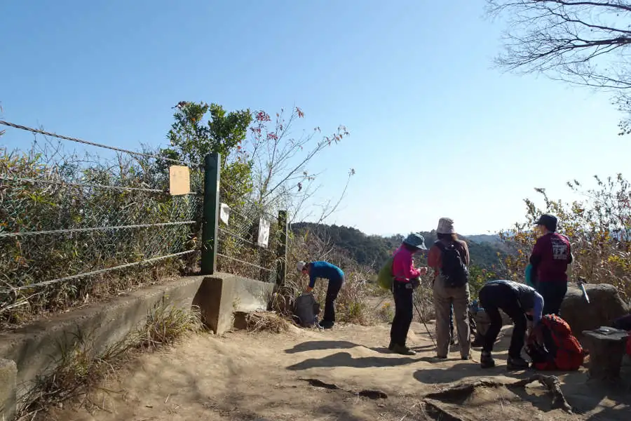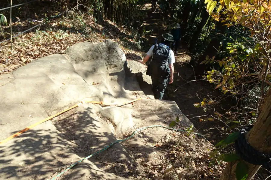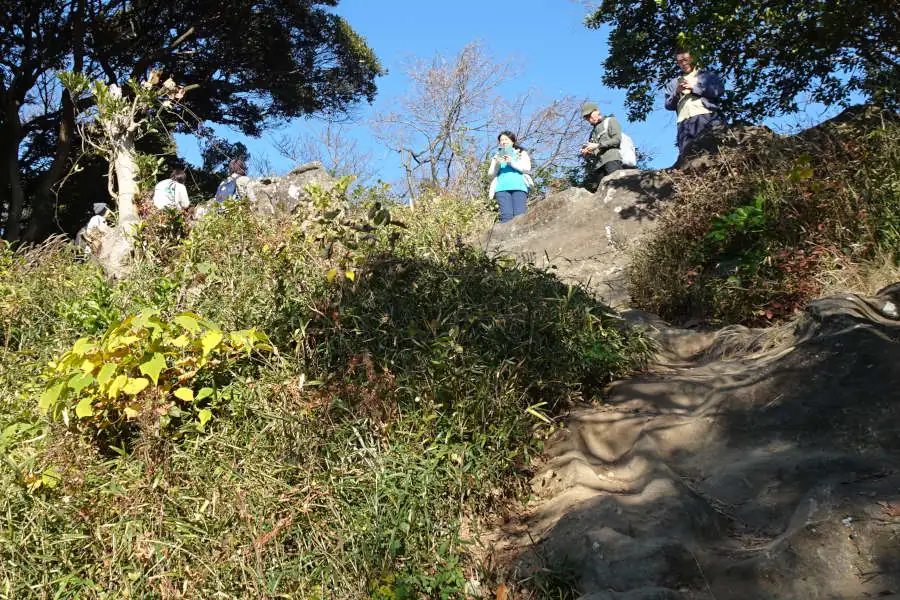 ここからは天園の尾根道をたどる整備されたハイキングコースです。左手の岩の上は「かながわの景勝50選」に選ばれた十王岩です。十王とは閻魔王など冥界の仏ですがここに祀られているのは3体だけでしょうか。