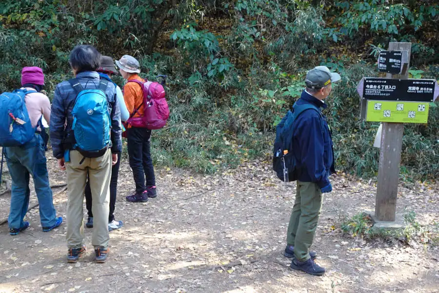 左手は今泉台団地への道で大船駅行きのバスもあるようです。ここから登ってきたのでしょう、老齢のパーティがガイドブックを眺めながら行く先を探していました。