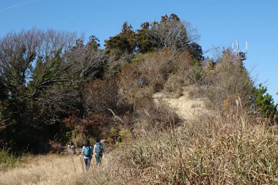 道標に導かれながら道を右に折れると急な登り、もう営業はしていないようですが桐慕茶屋からは山道が始まります。雑木林の中道をわずかに登ると今泉台団地への分岐、さらにひと登りするとベンチがある勝上嶽の山頂です。