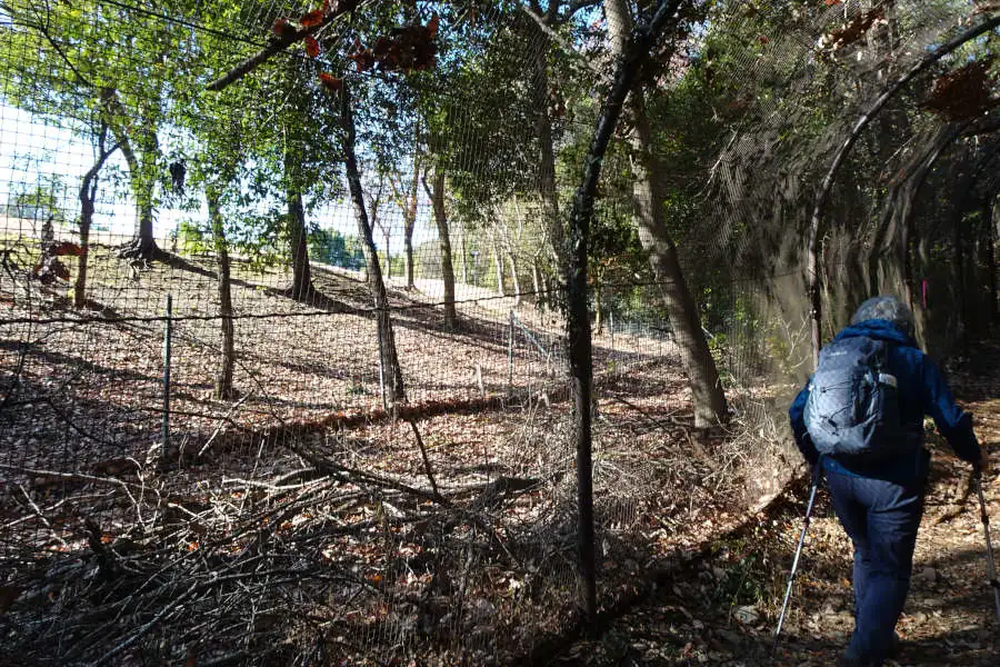 やがて道はゴルフ場の脇を緩やかに登って行きます。飛んでくるボールを防ぐフェンストンネルをくぐりながらしばらく歩くと巾着田への分岐、その先には高麗峠の分岐がありました。