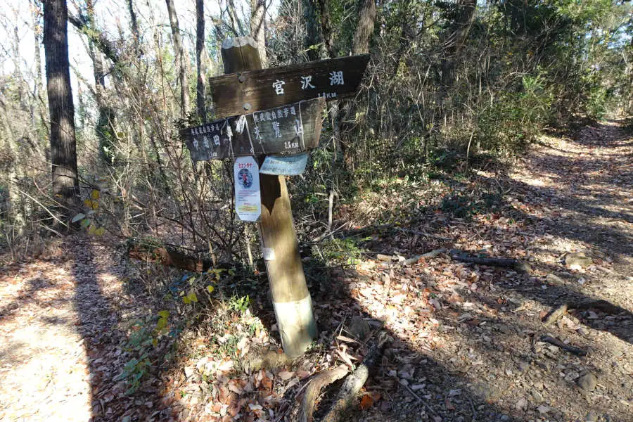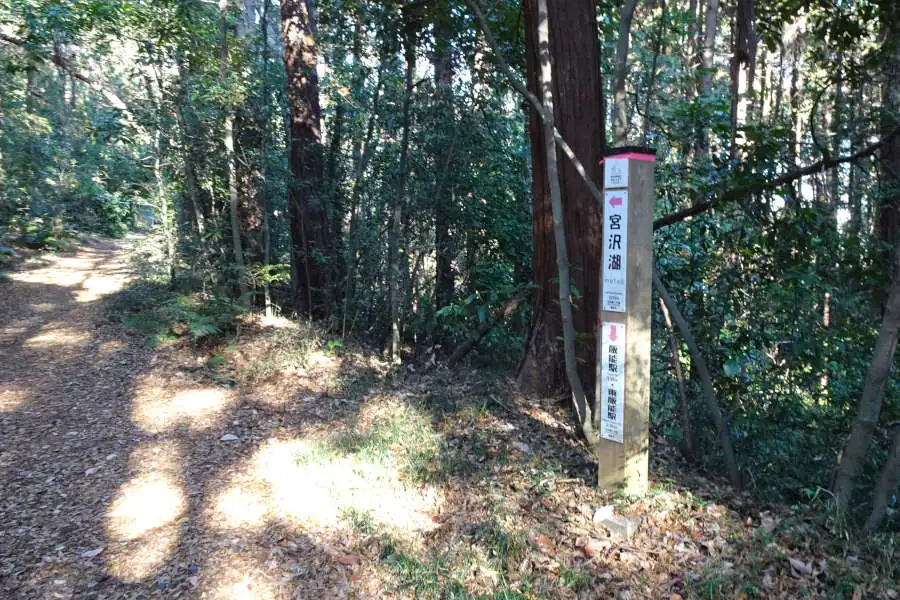 やがて道は国道299号線へと続く分岐、左手の道はゴルフ場のクラブハウスへと続く車道に沿った道です。ここからは緩やかなアップダウンが始まるところで宮沢アルプスの名前もあるようです。