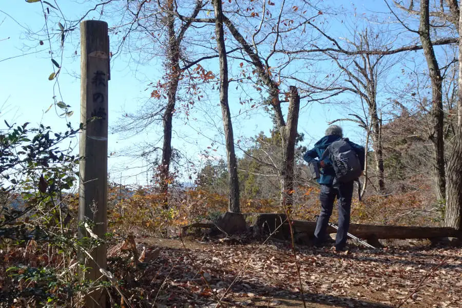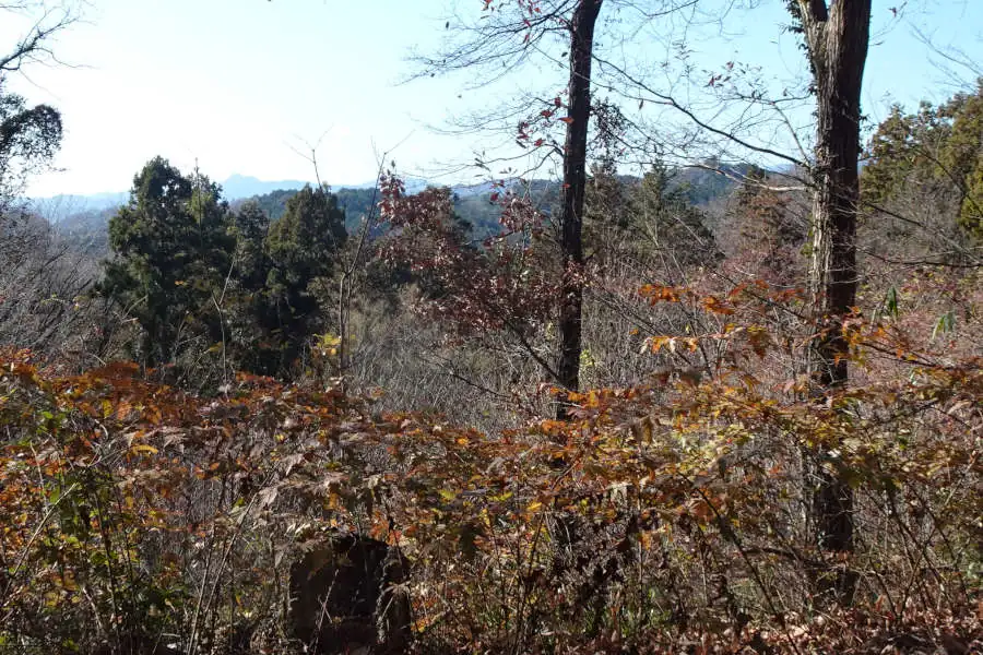 雑木林の中の良く踏まれた山道を歩くと萩の峰、ベンチに腰を下ろし昼食にしました。木立の先には青く霞んだ大岳山周辺の稜線が見えていました。