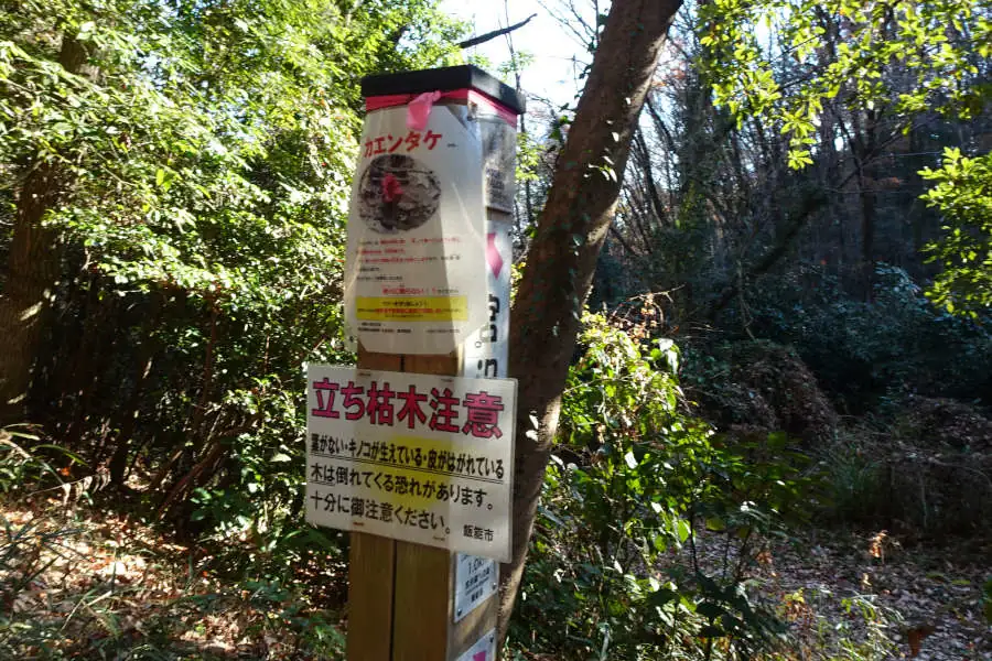 道標にはカエンダケ注意の張り紙がありました。枯れたナラなどに生えるキノコで死亡事故の危険が高いキノコとか。まだ見たことはありませんが触っただけでも炎症を引き起こすと言います。