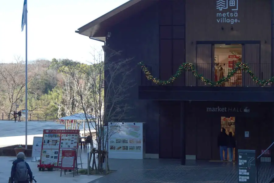 しばらく歩くとメッツァビレジの大きな駐車場です。駐車場脇の坂道はクリスマスのイルミネーションが飾られ、マーケットホールには土産物や軽食のお店がありました。