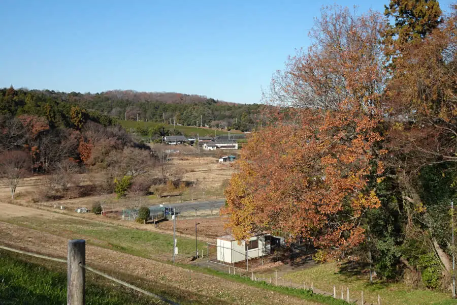 たどり着いた宮沢湖の堰堤からは奥武蔵の山里の景色が見えています。大きな柿の木にはまだ赤い実が残っていました。