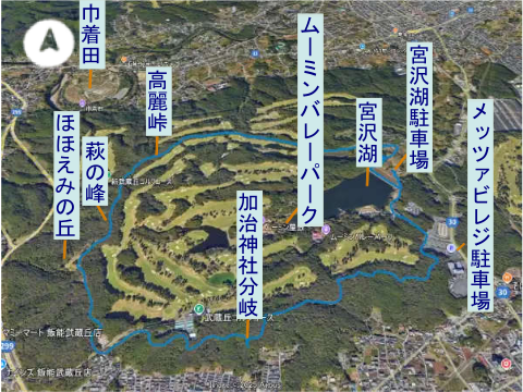 宮沢湖駐車場10:28~宮沢湖10:45~狭山茶田辺園~高麗峠11:31/36~萩の峰11:42/12:14~ほほえみの丘12:23~ムーミンメッツァ駐車場13:20~宮沢湖駐車場13:40