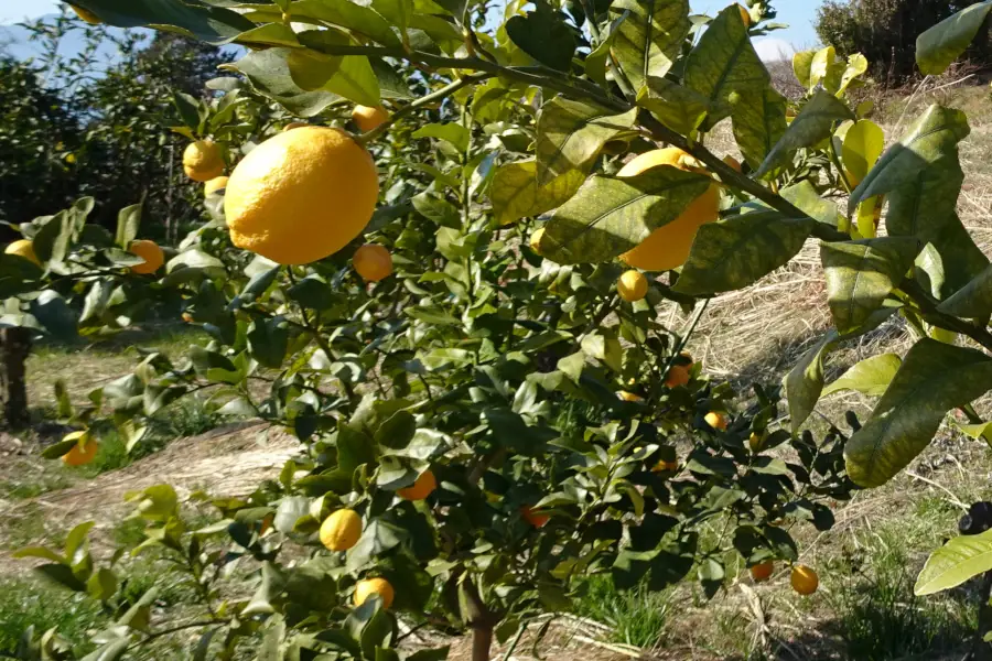 六本松跡からも耕作地の中を緩やかに登って行きます。黄色いみかんのほか湘南ゴールド、少し大きめのみかんは八朔でしょうか。