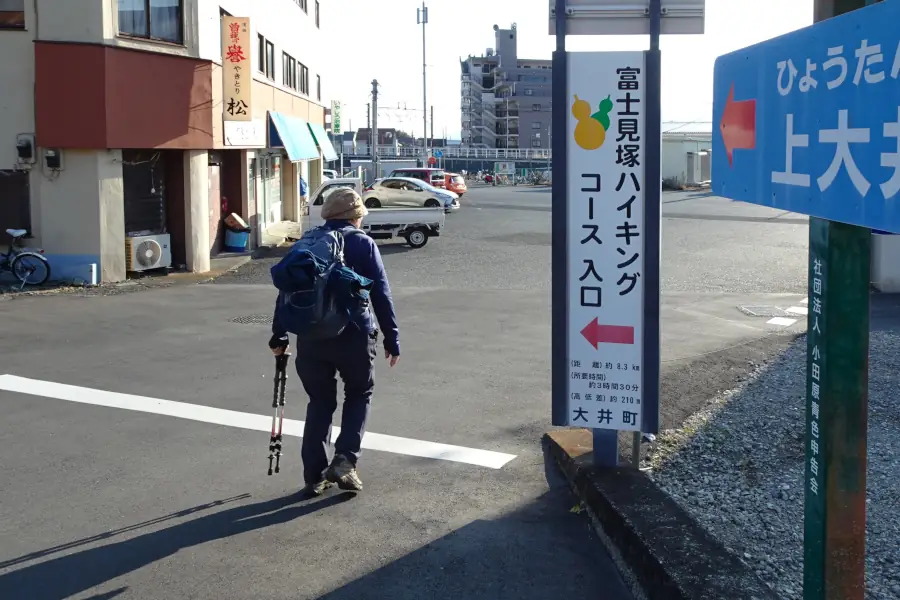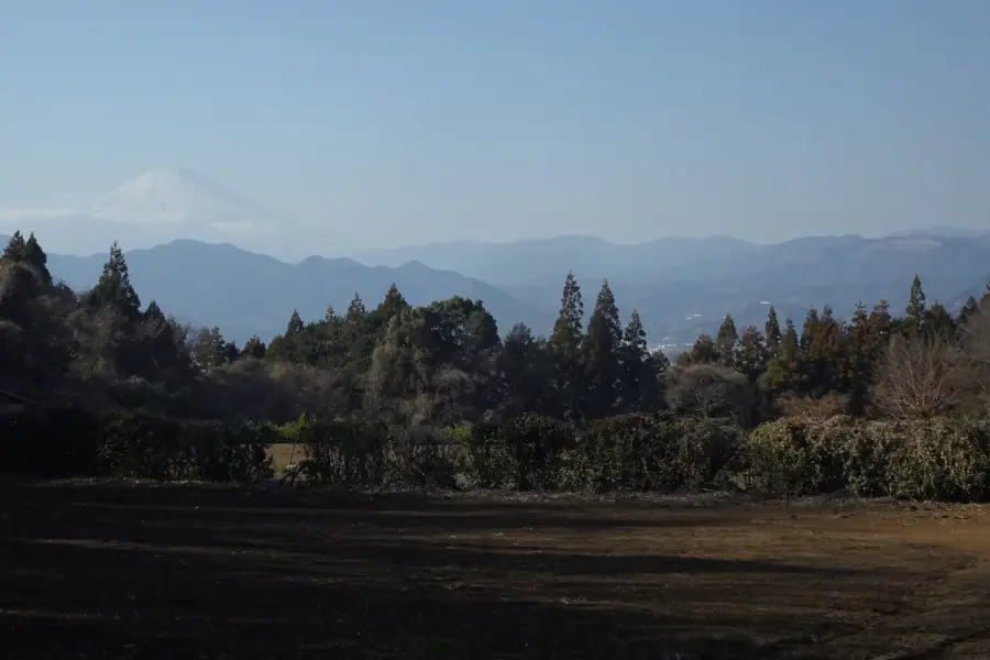 耕作地の中に続く舗装道路を登って行きます。ジグザグを繰り返しながら高度を上げると目の前に小田原の町並み、青空の下には明神ヶ岳や金時山など箱根の山々のパノラマが広がっています。しばらく雪が降っていないようで富士山は5合目付近から上に白い雪が積もっていました。