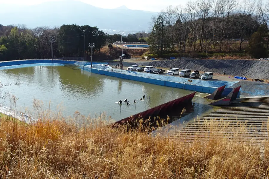 更に明るい車道を緩やかに下って行くとおおいゆめの里です。新しく作られた舗装道路の先に造られた小さな池はラ・レイエス湘南のサーフィンウェイブプール、サーフィンの練習ができるところと言います。波を作り出す造波板が大きな音を立てていました。